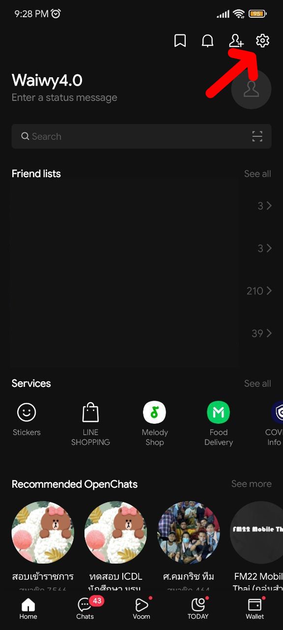 ใครที่ไม่ต้องการใช้งานไลน์แล้ว สามารถลบบัญชีได้แบบเดียวคือแบบถาวรเลยครับ เริ่มได้จากกดที่ปุ่ม Home > กดไอคอนฟันเฟืองขวาบน > แล้วกด Account