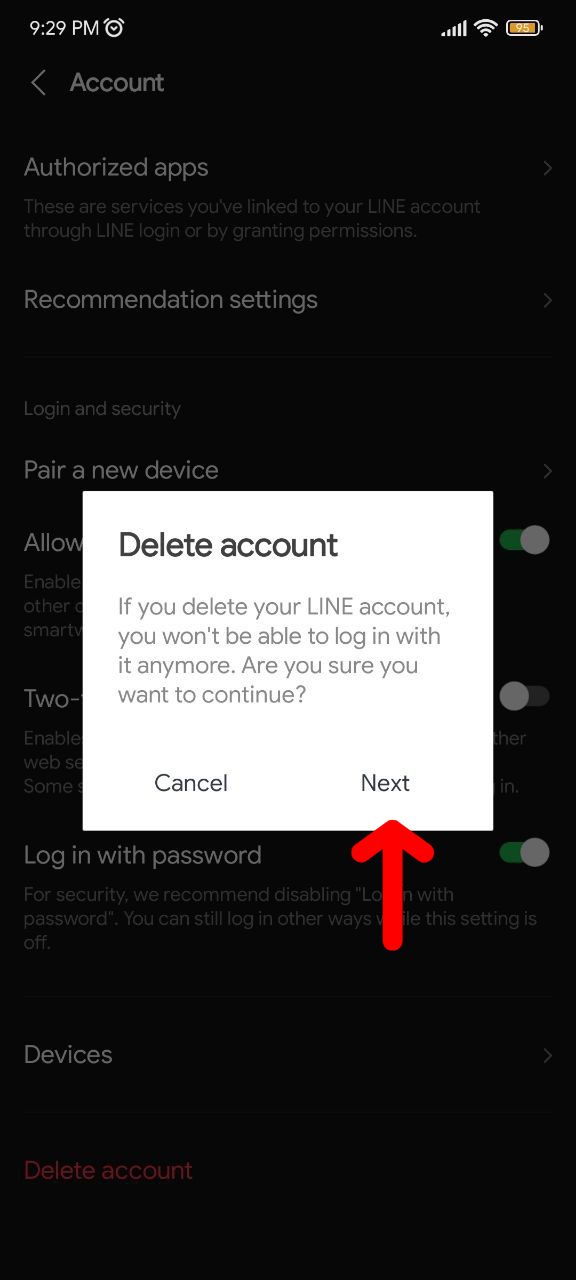 จากนั้นเลื่อนลงมาข้างล่าง กดปุ่ม Delete account > แล้วจะมีกล่องขึ้นมาให้กด Next