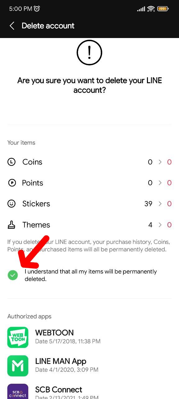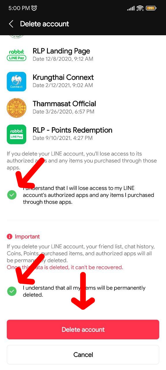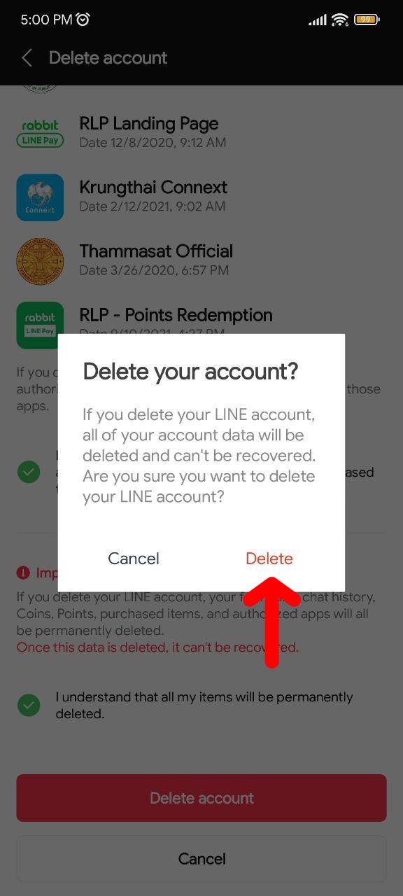 จากนั้นจะเป็นหน้าขึ้นมาให้เราดูว่าลบแล้วอะไรจะหายไปบ้าง ก็ให้กดยอมรับทั้งหมด 3 ปุ่ม > เลื่อนลงมาล่างสุดก็ให้กด Delete account > แล้วกด Delete อีกเป็นครั้งสุดท้าย ถือว่าลบบัญชีไลน์เรียบร้อยแล้วครับ