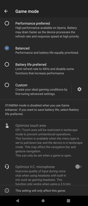 มีให้เลือกปรับได้ 3 โหมด ได้แก่ Performance preferred จัดเต็มสุด สูบแบตสุด, Balanced เน้นสมดุล ระหว่างประสิทธิภาพและอายุแบตเตอรี่, Battery life preferred ลดทอนประสิทธิภาพลง ยืดอายุแบตเตอรี่ให้ยาวนาน และมีโหมด Custom ให้เรากำหนดค่าต่าง ๆ เองได้ด้วย ทั้งอัตรารีเฟรชหน้าจอ อัตราตอบสนองการสัมผัส และความแม่นยำของการติดตามการสัมผัส ปรับแยกกันแต่ละเกม ของใครของมันได้เลย