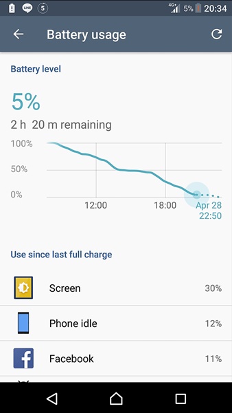 Xperia XZs มาพร้อมกับแบตเตอรี่ขนาดถึง 2900mAh ถือว่าไม่เล็กไม่ใหญ่ จากการใช้งานปกติของผมจาก 100% ตั้งแต่เช้าจดเย็น กลับถึงบ้านค่ำๆ เหลือแบตเตอรี่อยู่ประมาณ 5% นั่นหมายความว่าใช้งานได้ครบ 1 วัน บางวันใช้งานไม่มากกลับถึงบ้านก็เหลือประมาณ 15% สว่นของ Screen on time นั้นทำได้ประมาณ 4.30 ชั่วโมง ถือว่าน่าพอใจสำหรับมือถือสเปกระดับนี้และให้แบตเตอรี่มาไม่ใหญ่มาก