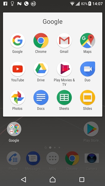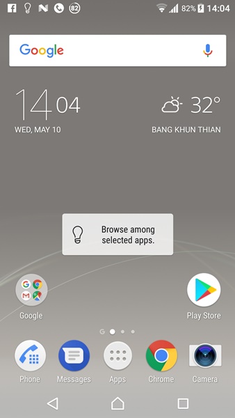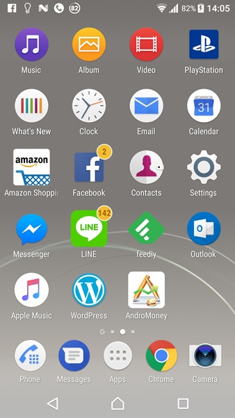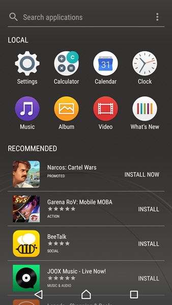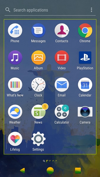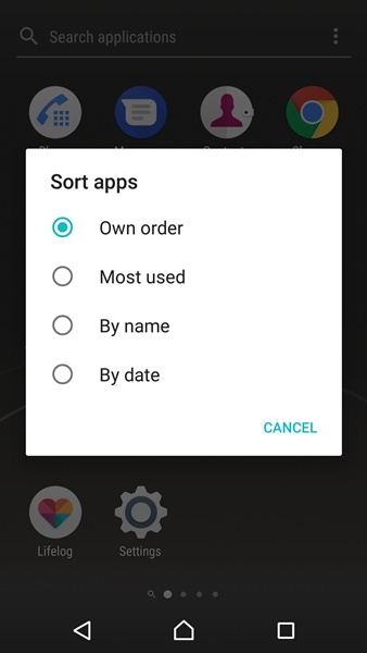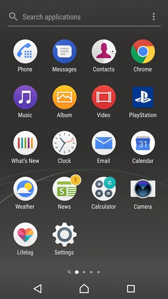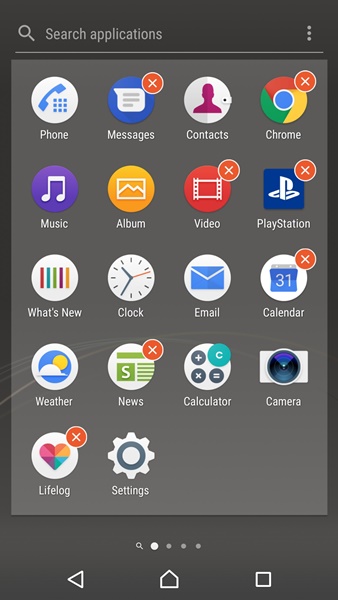 Xperia Home ยังคงมี App Drawer ให้ใช้งานตามมาตรฐาน Android โดยอาศัยการปัดไปด้านข้างเพื่อเปลี่ยนหน้า นอกจากนั้นเราสามารถเลือกเรียงลำดับ app ได้ตามชื่อ, วันที่ติดตั้ง หรือจัดเรียงเองตามต้องการ และยังสามารถสั่งลบ app ที่ไม่ต้องการออกได้ด้วย