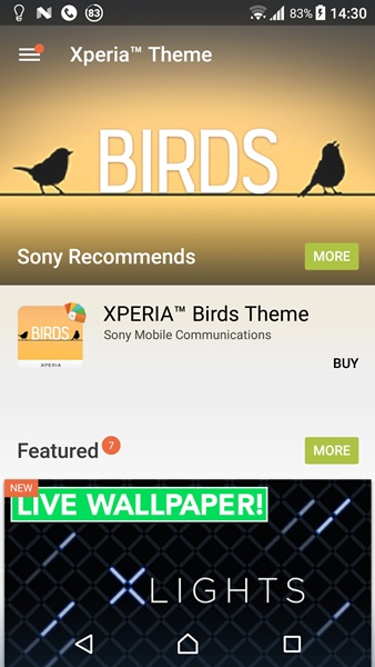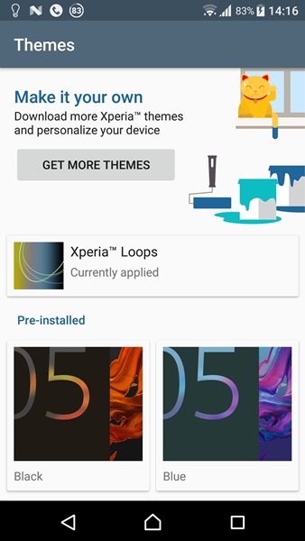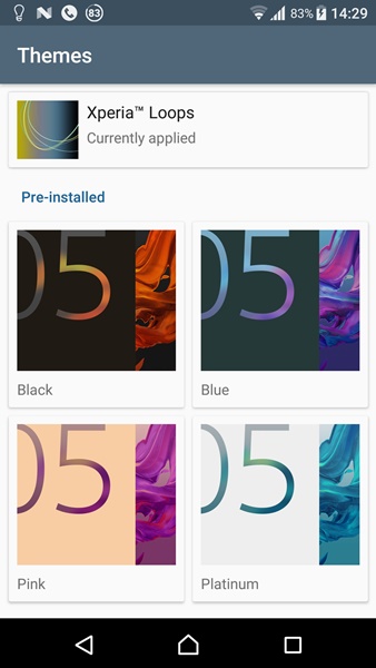 เราสามารถเปลี่ยน Theme ของ Xperia Home ได้ตามต้องการ โดยมีให้เลือกหลายแบบ ที่ติดตั้งมาแล้วกับเครื่องจะมี 5 แบบ ถ้าจะไปโหลดมาเพิ่มก็มีทั้งแบบเสียตังค์และฟรี แต่เท่าที่ไล่ดูจะเสียตังค์ซะเยอะ โดยแต่ละ Theme จะเปลี่ยนได้ทั้งหน้าตาและเสียงของระบบโดยรวม