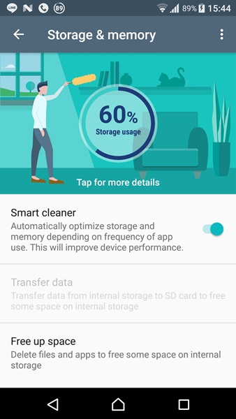 ฟีเจอร์อยู่ในส่วน Storage ของระบบ ความสามารถของมันคือการ Clear RAM และกำจัดข้อมูลขยะภายในเครื่องแบบอัตโนมัตินั่นเอง ซึ่งตัวฟีเจอร์จะถูกเปิดเอาไว้เป็นค่าตั้งต้นมาจากโรงงาน ถ้าเราไม่ชอบก็สามารถปิดเองได้ และสามาถสั่งลบข้อมูลขยะได้เองตามที่ต้องการด้วย