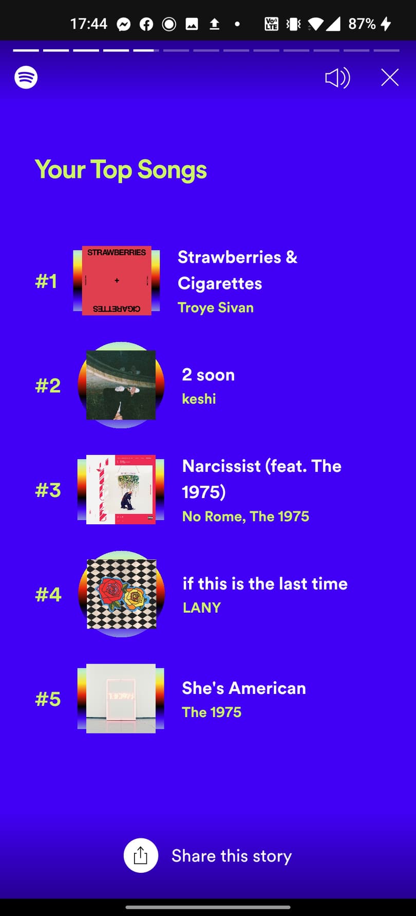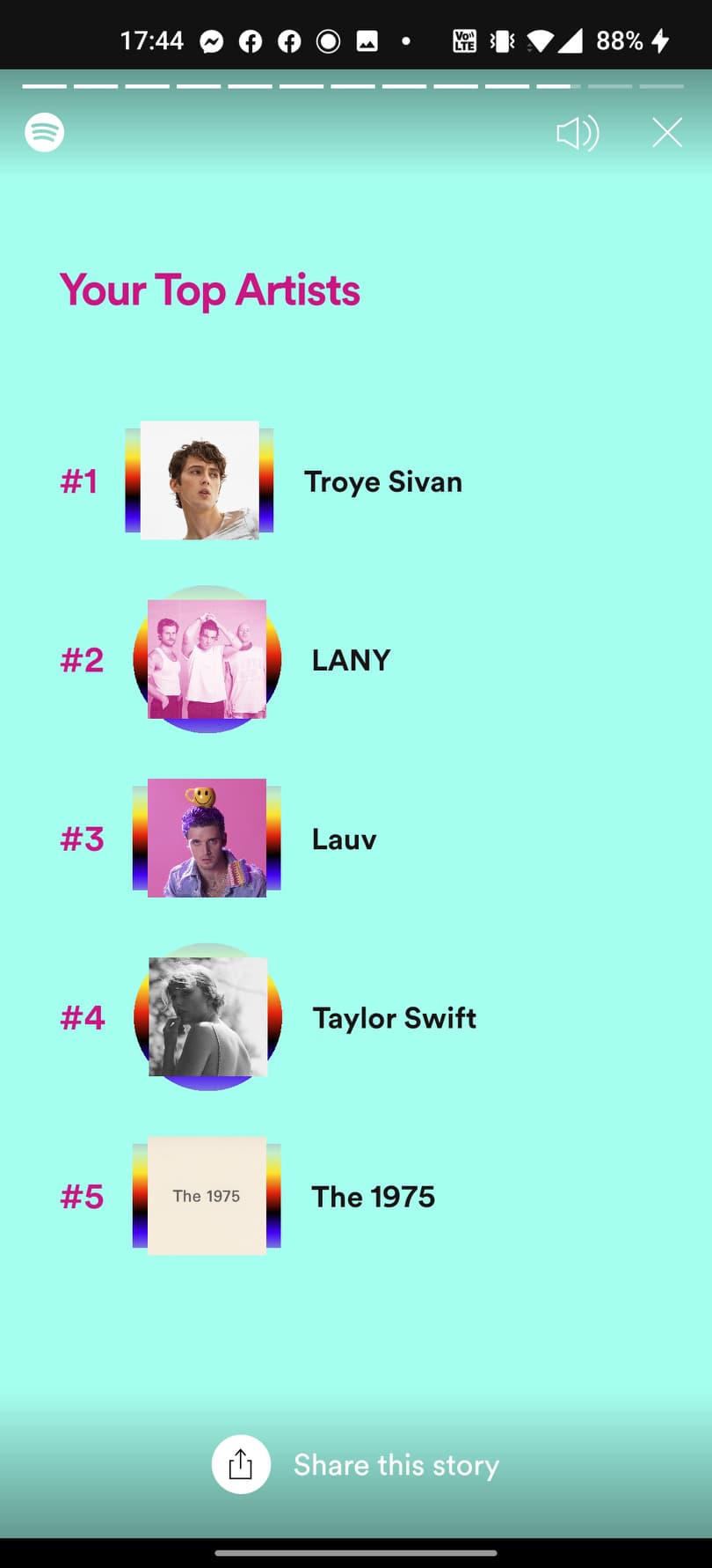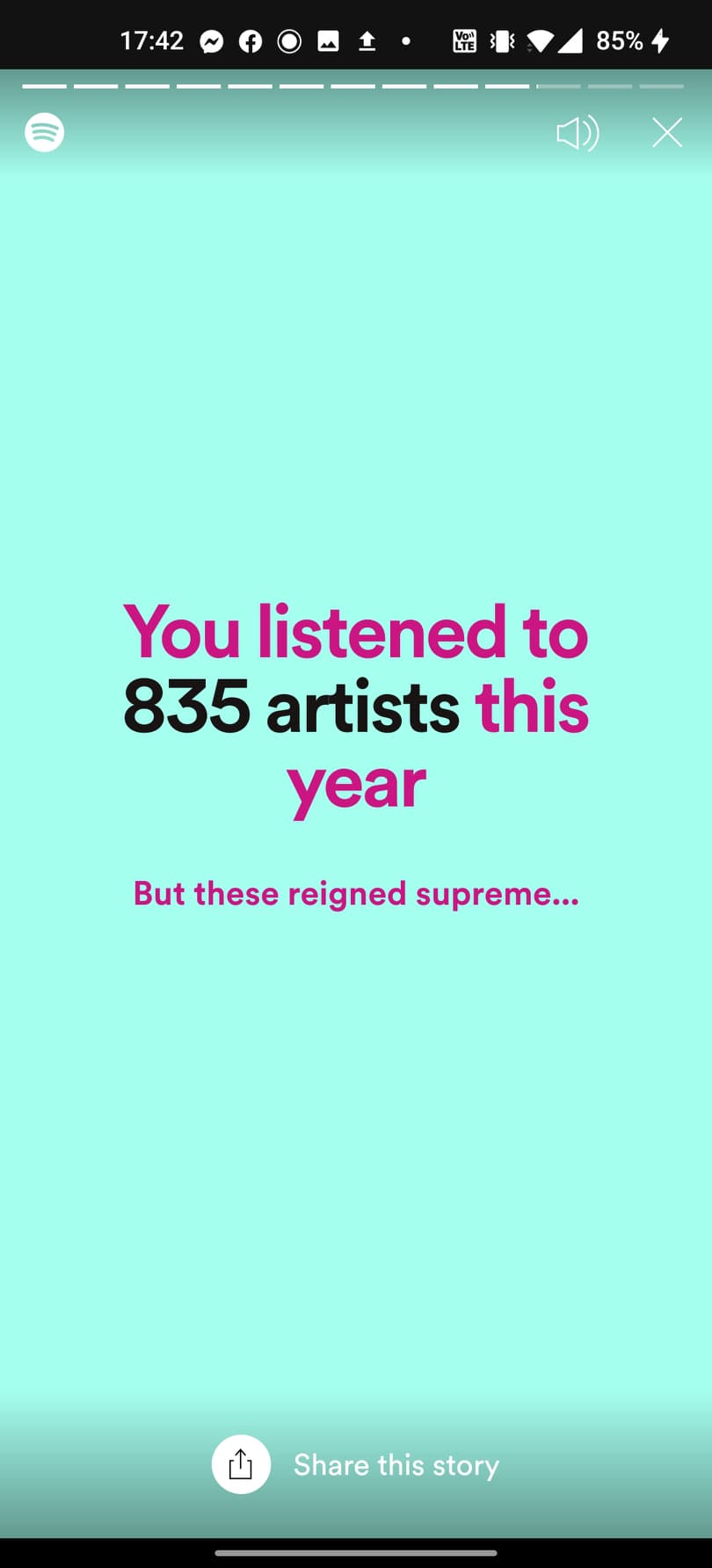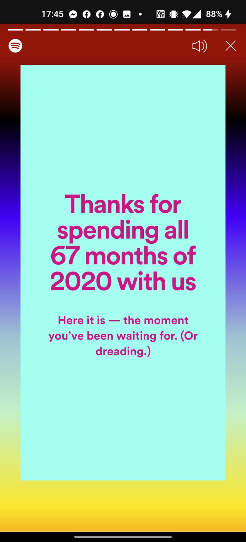 พอเข้ามาแล้ว จะเห็นว่า Spotify จะมีฟีเจอร์ Story ให้เราเลือกกดเข้าไปดูสถิติทั้งหมด 12 อัน ในส่วนนี้ทางแพลตฟอร์มจะบอกเราว่า ในปี 2020 ที่ผ่านมา เราฟังเพลงไหนเยอะที่สุด ฟังศิลปินท่านไหนบ้าง รวมไปถึงแนวเพลงที่ฟังส่วนมากเป็นเพลงไหน ฯลฯ