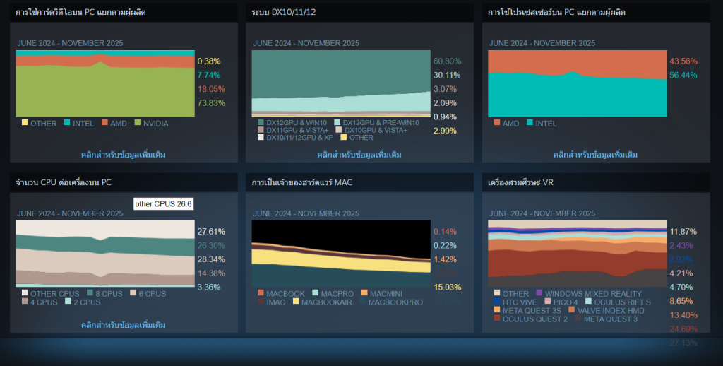 ในด้านฮาร์ดแวร์ มีการเปลี่ยนแปลงสำคัญเมื่อ NVIDIA RTX 4060 Laptop ขึ้นเป็นการ์ดจอยอดนิยมอันดับหนึ่งบน Steam เป็นครั้งแรก ด้วยส่วนแบ่ง 4.22% แซง RTX 3060 Desktop ที่ครองอันดับมานาน ส่วน RTX 3050 ยังคงตามมาติด ๆ ในอันดับสาม ขณะที่ตลาดรวม GPU ยังเป็นของ NVIDIA อย่างท่วมท้นด้วยสัดส่วนสูงถึง 73.83% ตามด้วย AMD 18.05% และ Intel 7.74%