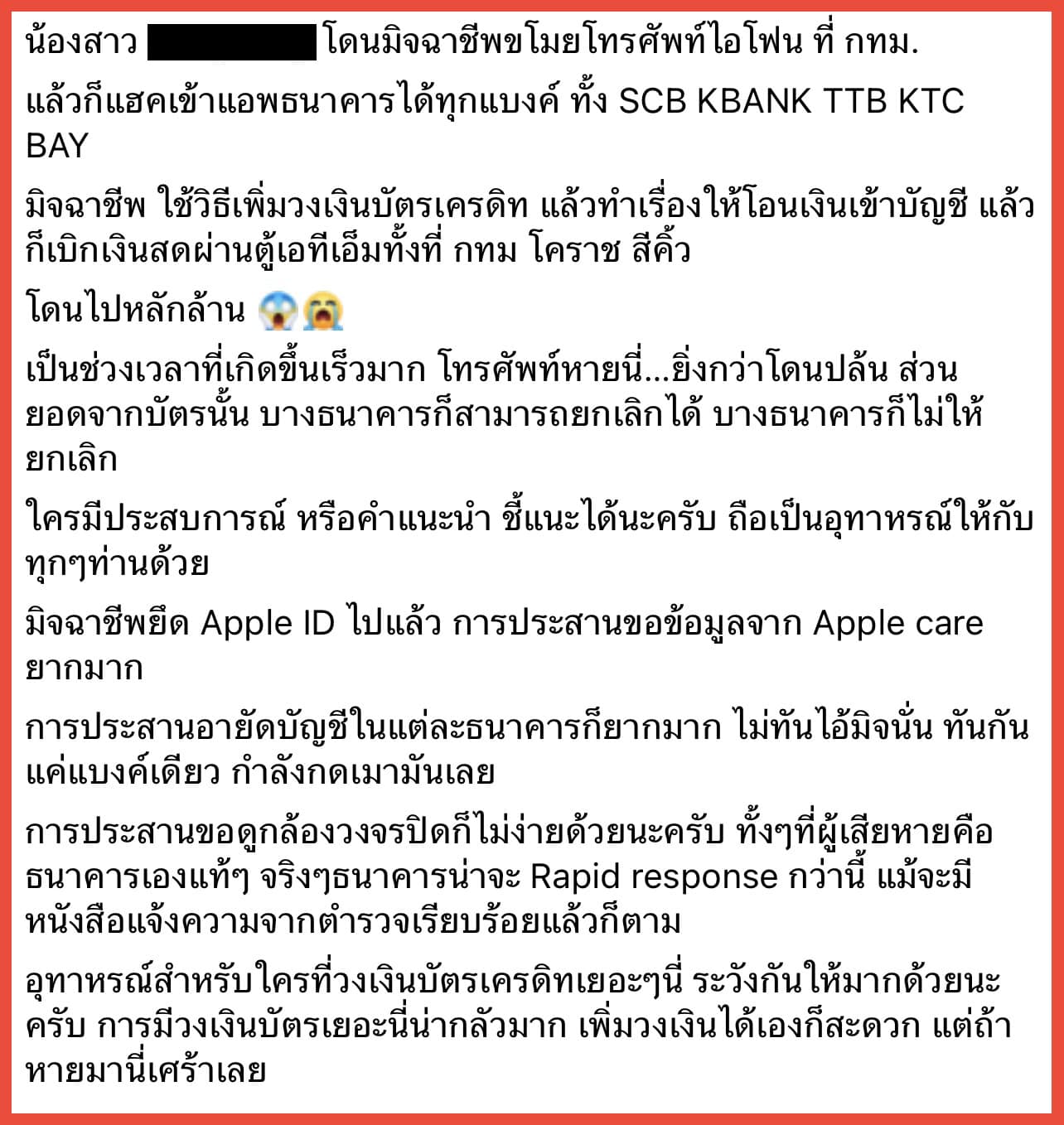 วันนี้มีข่าวคนโดนขโมยมือถือ iPhone แล้วโจรแฮคเข้าธนาคารที่มีในเครื่องได้ทั้งหมด ทำให้เสียเงินไปร่วมล้านบาท โดยทางผู้เสียหายระบุว่าโจรสามารถเข้าถึง Apple ID ทำให้เข้าถึงแอปต่าง ๆ และระบบภายในได้อย่างรวดเร็ว ไม่ทันไปอายัดแต่ละบัญชีกับทางธนาคาร จึงออกมาเล่าเป็นอุทาหรณ์เตือนใจกัน
