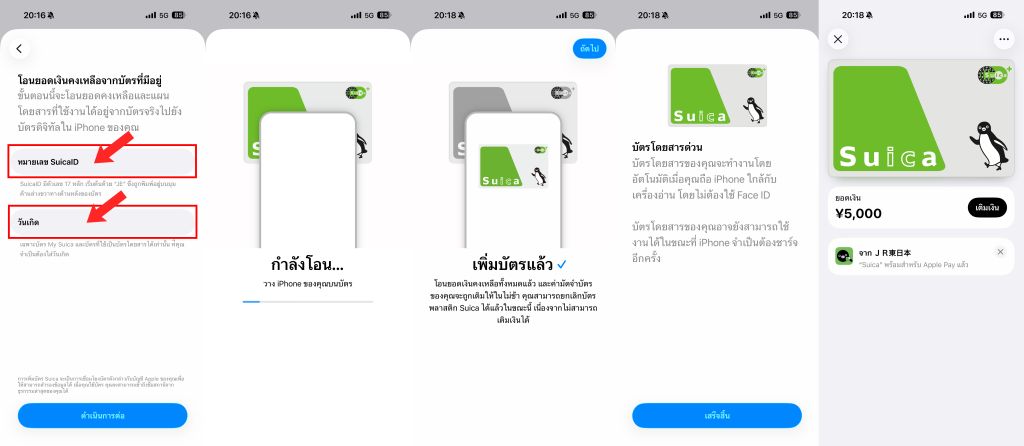- นำ iPhone ไปแตะกับบัตร Suica เพื่อโอนข้อมูลเข้ามาในเครื่อง