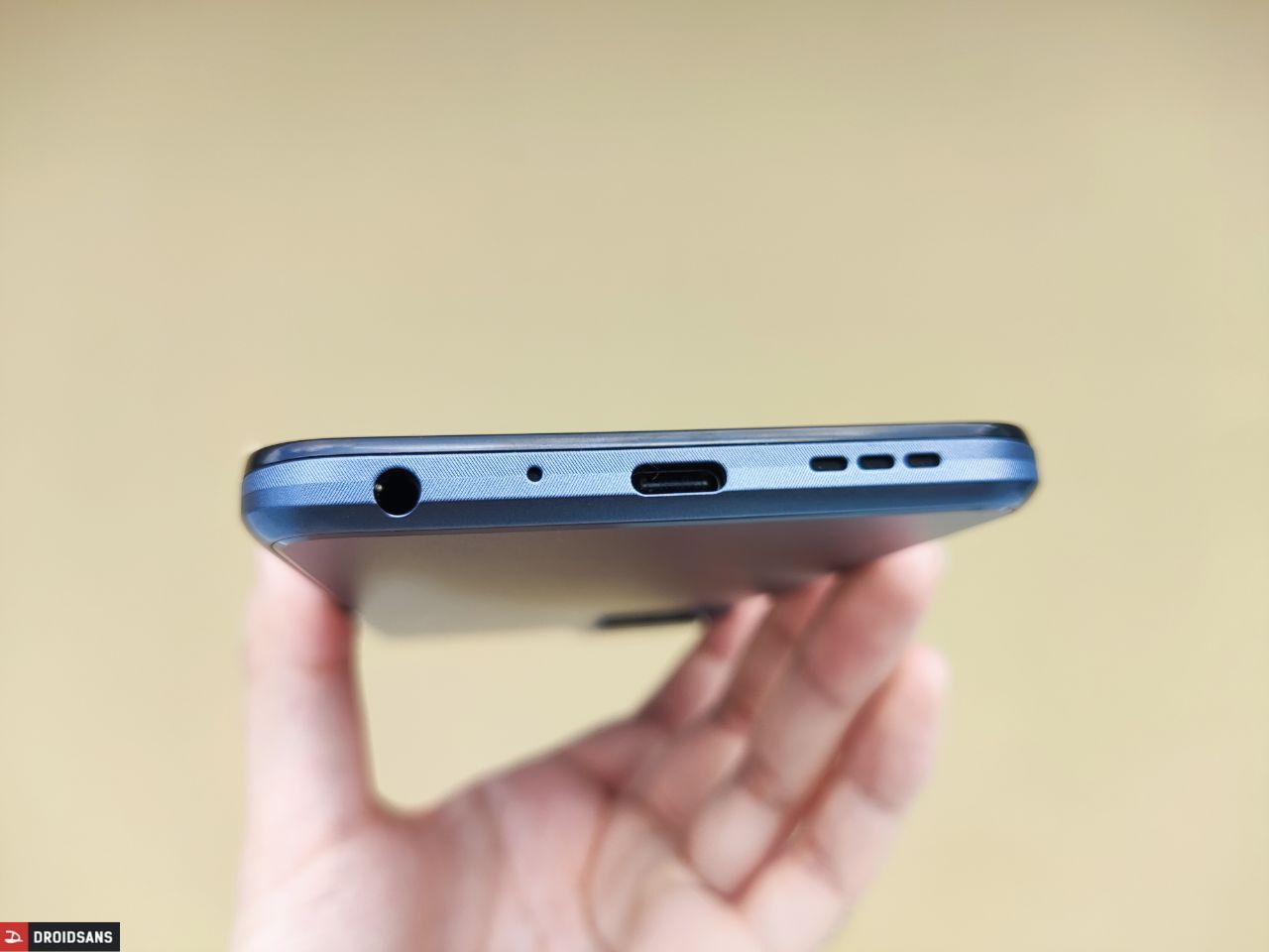 ขอบด้านล่างของเครื่องมีรูเสียบหูฟัง 3.5 มม. รูไมโครโฟน ช่องชาร์จ USB-C มีลำโพงใช้คู่กับอีกตัวที่อยู่ด้านบน เป็นระบบสเตอริโอ