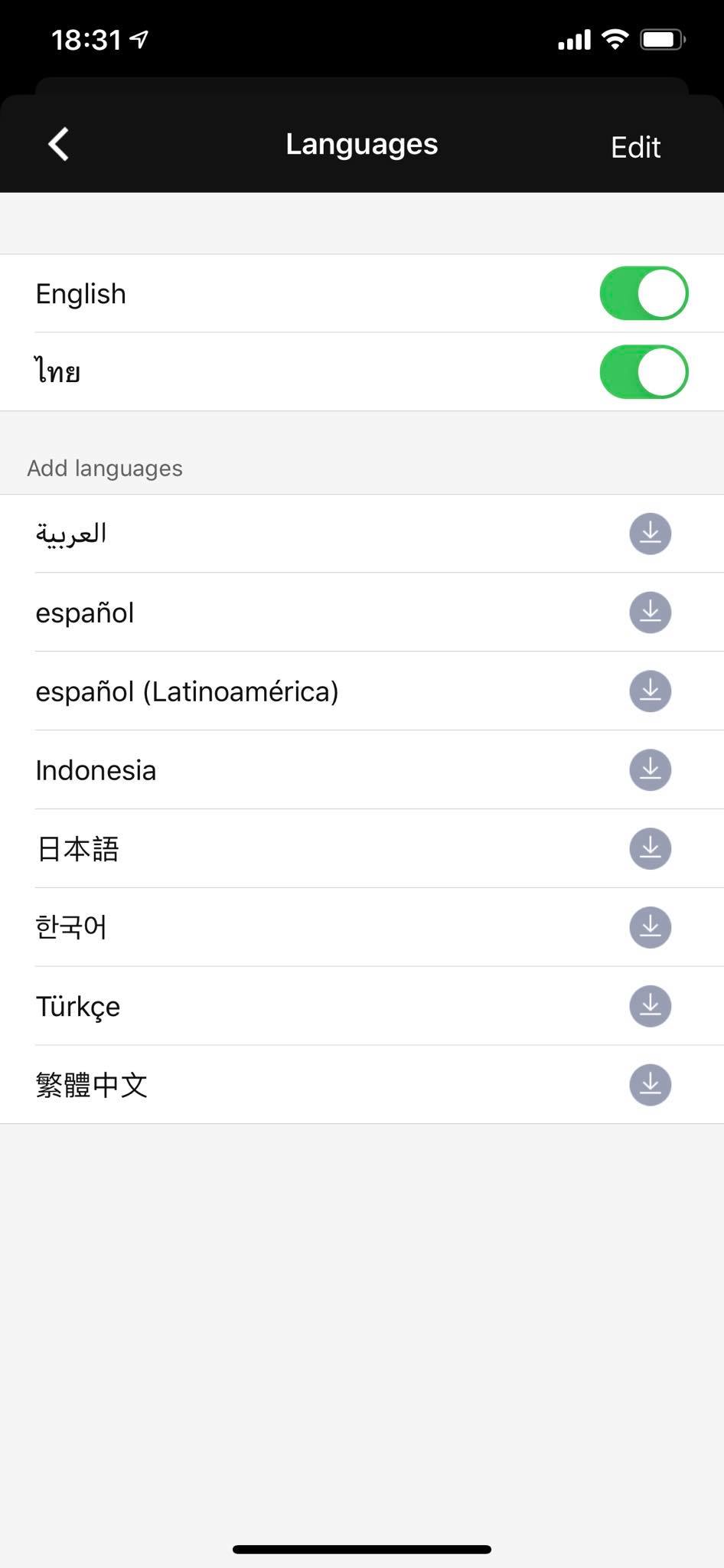 - ในกรณีที่อยากให้พิมพ์ภาษาไทยแล้วโชว์ Sticker ด้วย ให้เข้าไปที่ Languages กดดาวน์โหลด ภาษาไทย (หรือจะใช้ภาษาอื่นๆ ก็ได้นะ)