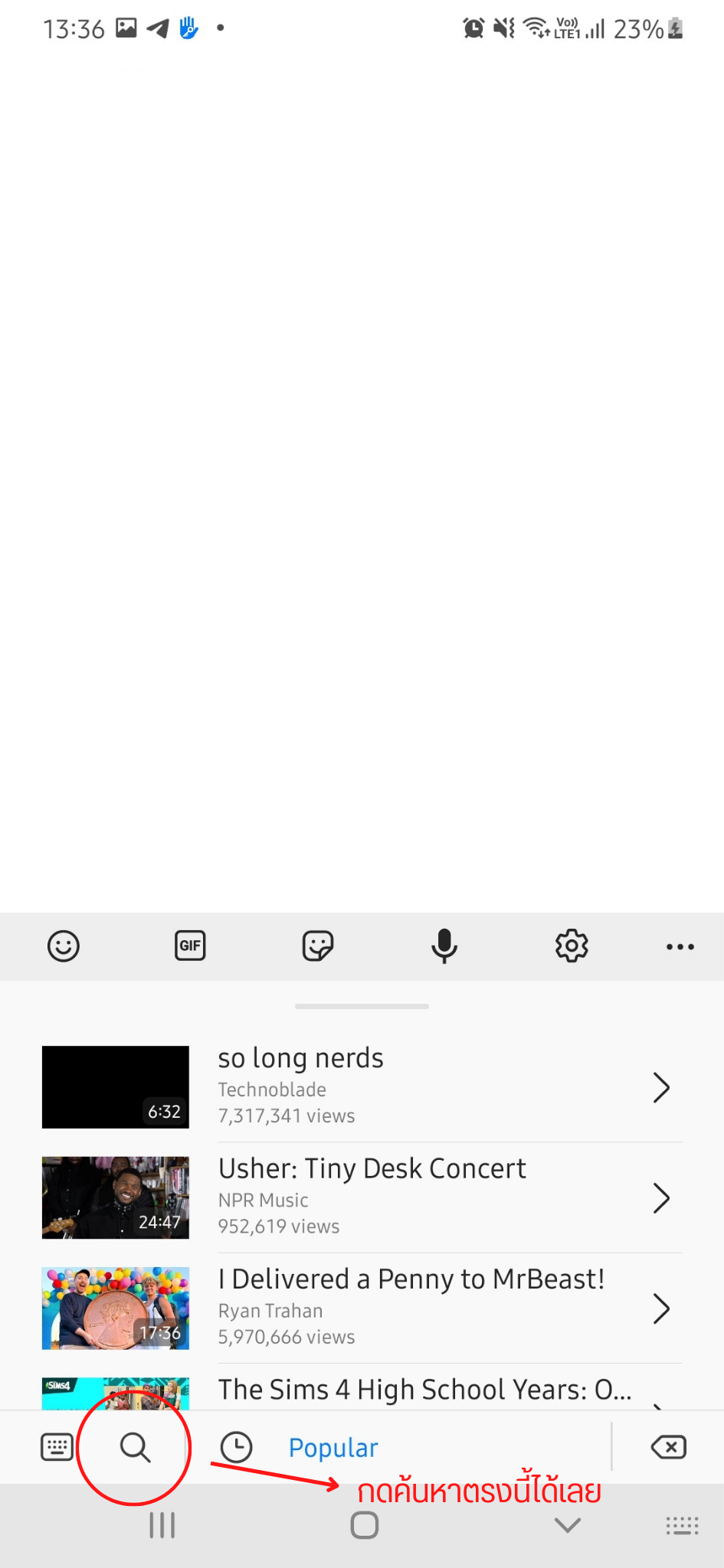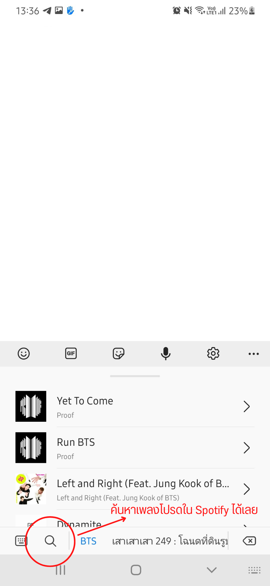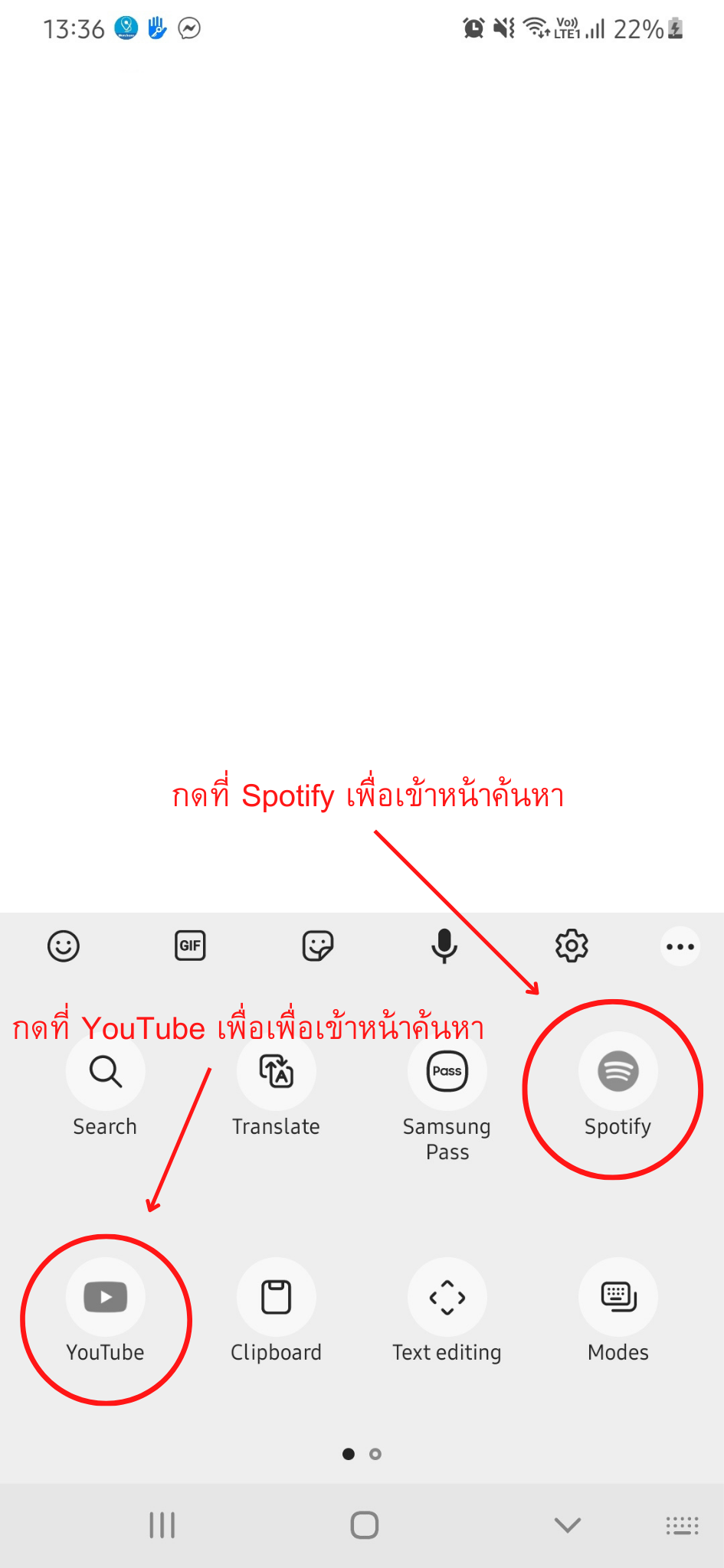 มีหลายครั้งที่เราอยากจะแชร์เพลงโปรดหรือคลิปสนุก ๆ ให้คนอื่นได้ดูด้วย แต่จะต้องออกจากแอปแชทเพื่อเข้าแอปเหล่านั้นเพื่อไปกดค้นหากดกอปปี้ลิงก์ แล้วยังจะต้องกดกลับมาที่แอปแชทเพื่อจะกดวางลิงก์อีกที ทำให้เสียเวลาและเสียอรรถรสในการคุยพอสมควรเลย แต่ Samsung Keyboard สามารถทำสิ่งเหล่านี้ได้แค่กดที่จุดสามจุด และกดไปที่ปุ่ม YouTube หรือ Spotify จากนั้นเราสามารถค้นหาเพลงหรือคลิปนั้น ๆ ได้บนคีย์บอร์ดเลย