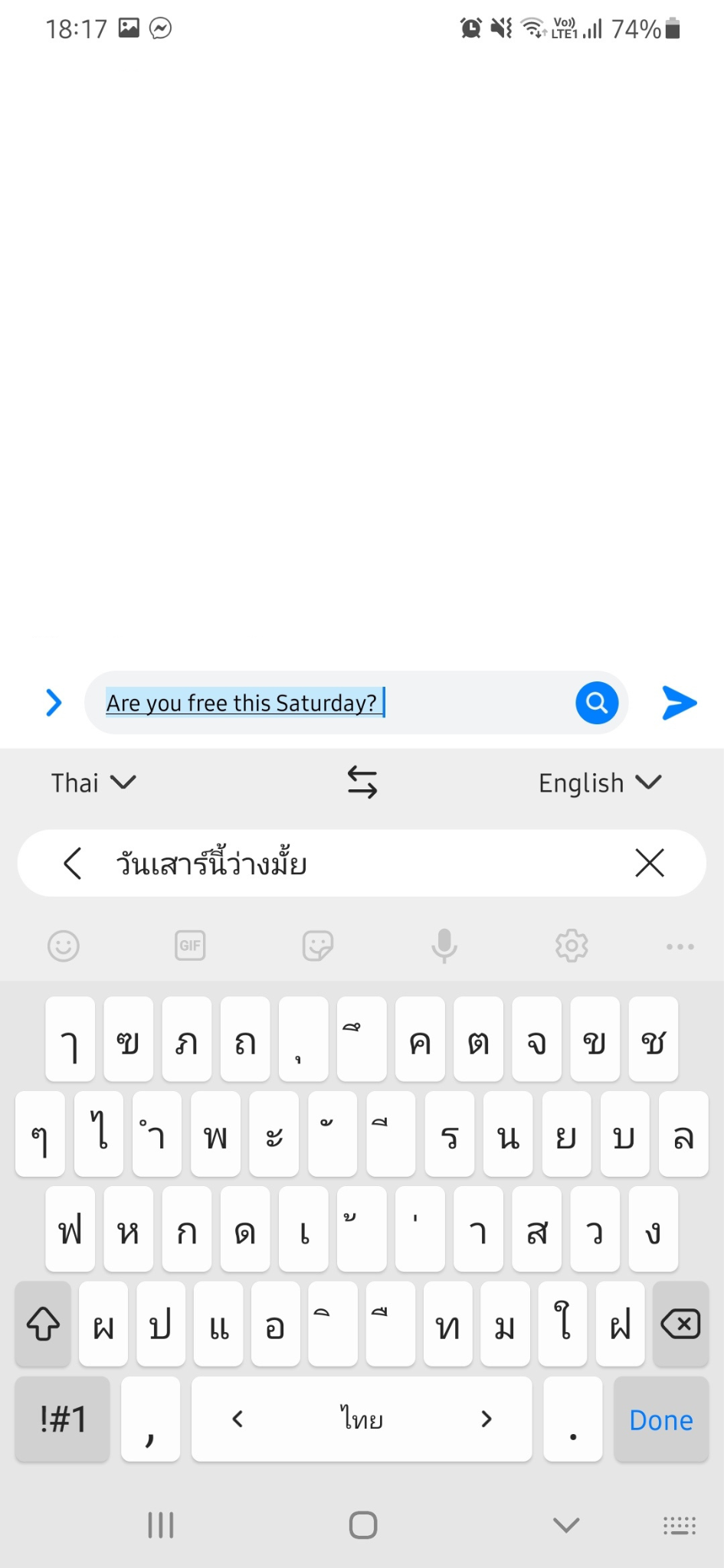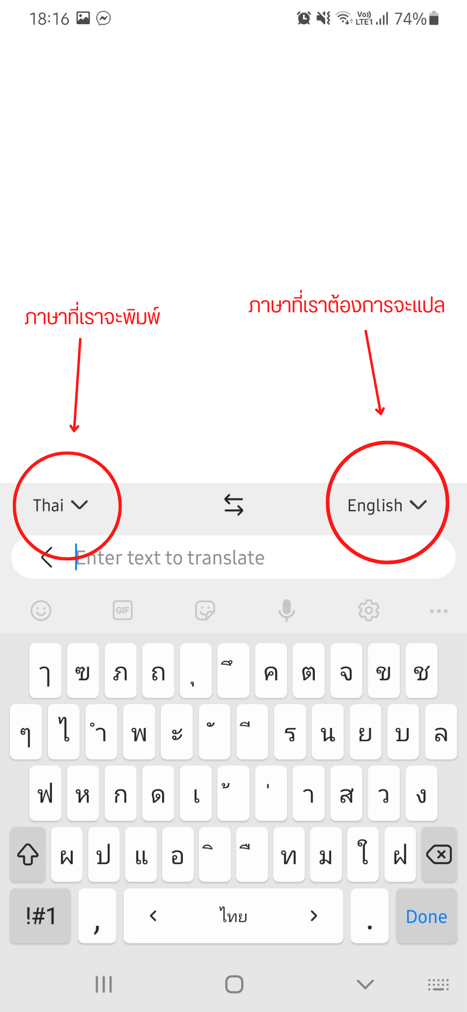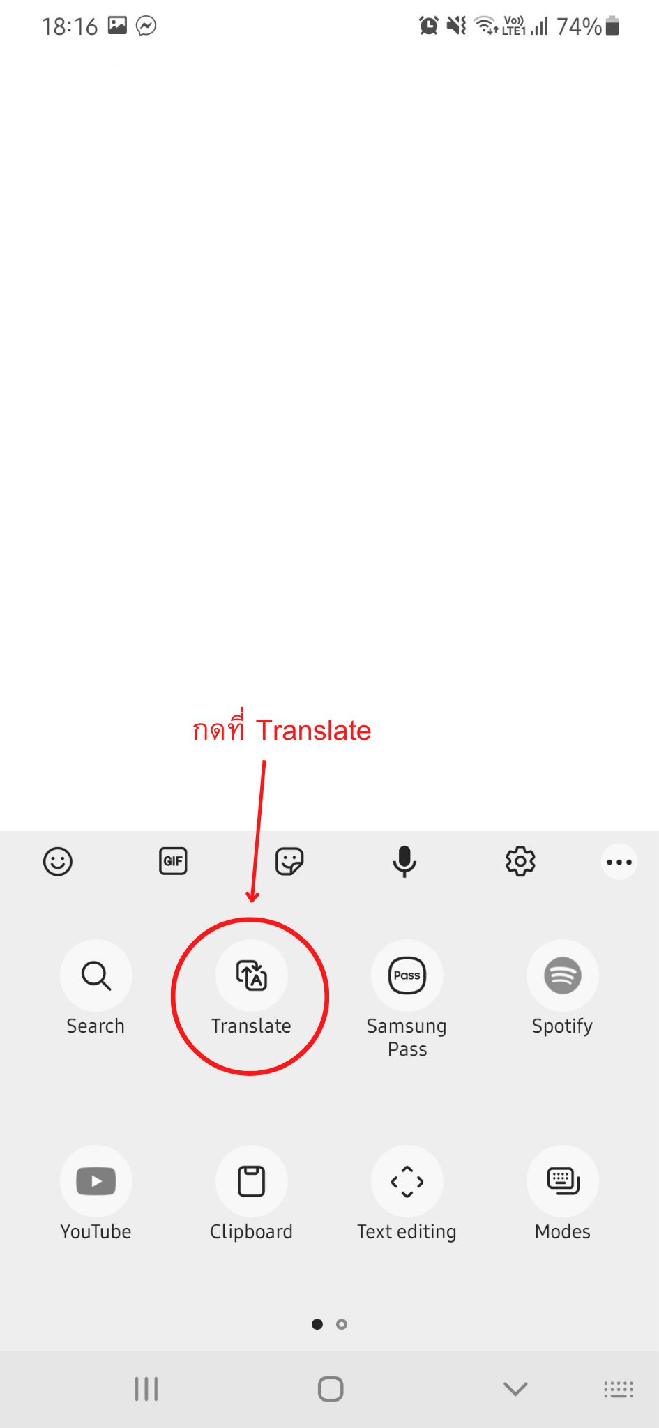 หากอยากคุยกันเป็นภาษาต่างประเทศแต่ไม่แน่ใจว่าจะพิมพ์ยังไง ก็แค่ใช้ฟีเจอร์แปลภาษาบน Samsung Keyboard ซึ่งมีภาษาให้เลือกมากมายครบทุกความต้องการของเราแน่นอน แต่ต้องบอกก่อนว่าผลที่ได้ก็ไม่ได้ตรง 100% เสมอไปนะ วิธีใช้งานคือ กดไปที่จุดสามจุด และไปที่ Translate จากนั้นก็เลือกได้เลยว่าเราจะพิมพ์ภาษาอะไรและให้แปลไปเป็นภาษาอะไร