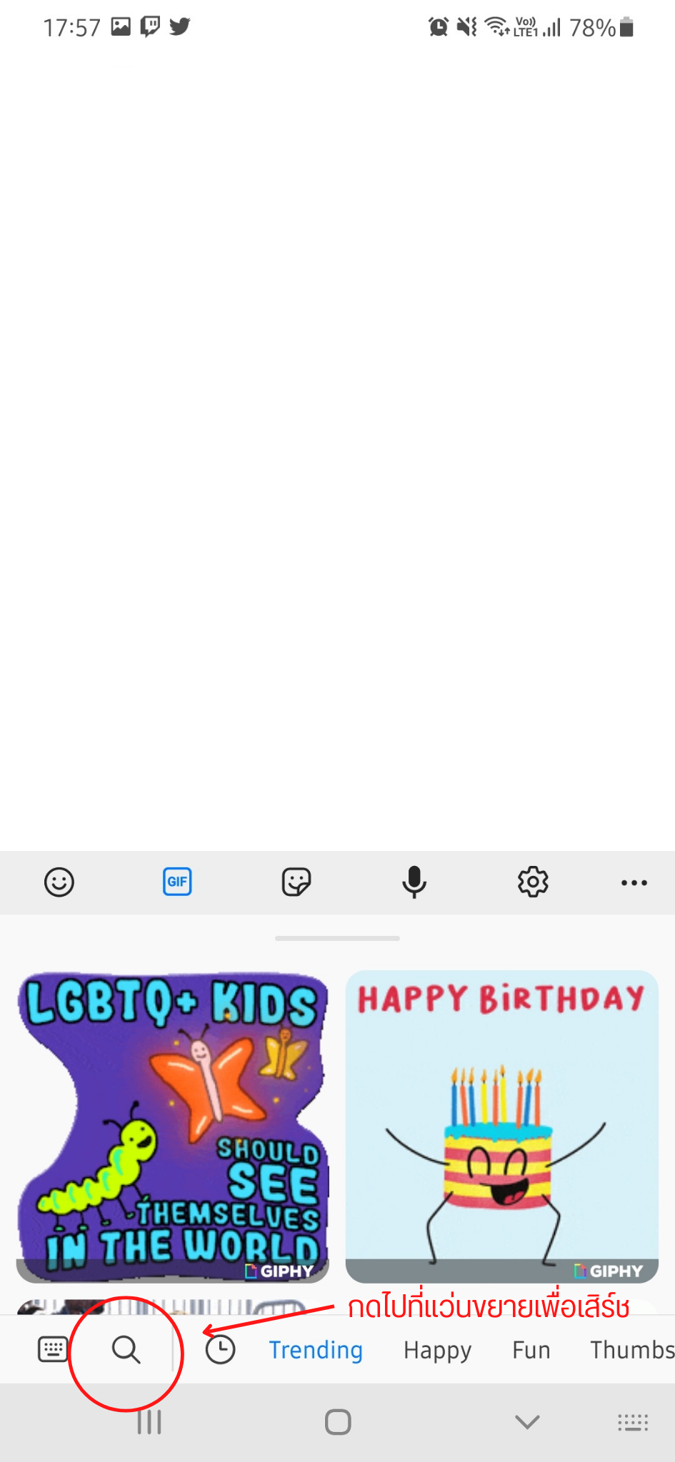 หากเราคุยกับเพื่อนอยู่แล้วต้องการแสดงอารมณ์ผ่านไฟล์ GIF ต่าง ๆ ก็ไม่ต้องกดออกไปหานอกแอปให้เสียเวลา เพราะว่าเราสามารถค้นหาไฟล์ GIF ผ่าน Samsung Keyboard และส่งให้เพื่อนได้เลย วิธีการก็แค่กดไปที่คำว่า GIF สามารถเสิร์ช GIF ที่เราต้องการด้วยการกดไปที่แว่นขยายและพิมพ์ภาษาไทยหรือภาษาอังกฤษก็ได้ แค่นี้ก็จะมี GIF ขึ้นมาให้เลือกมากมายเลย