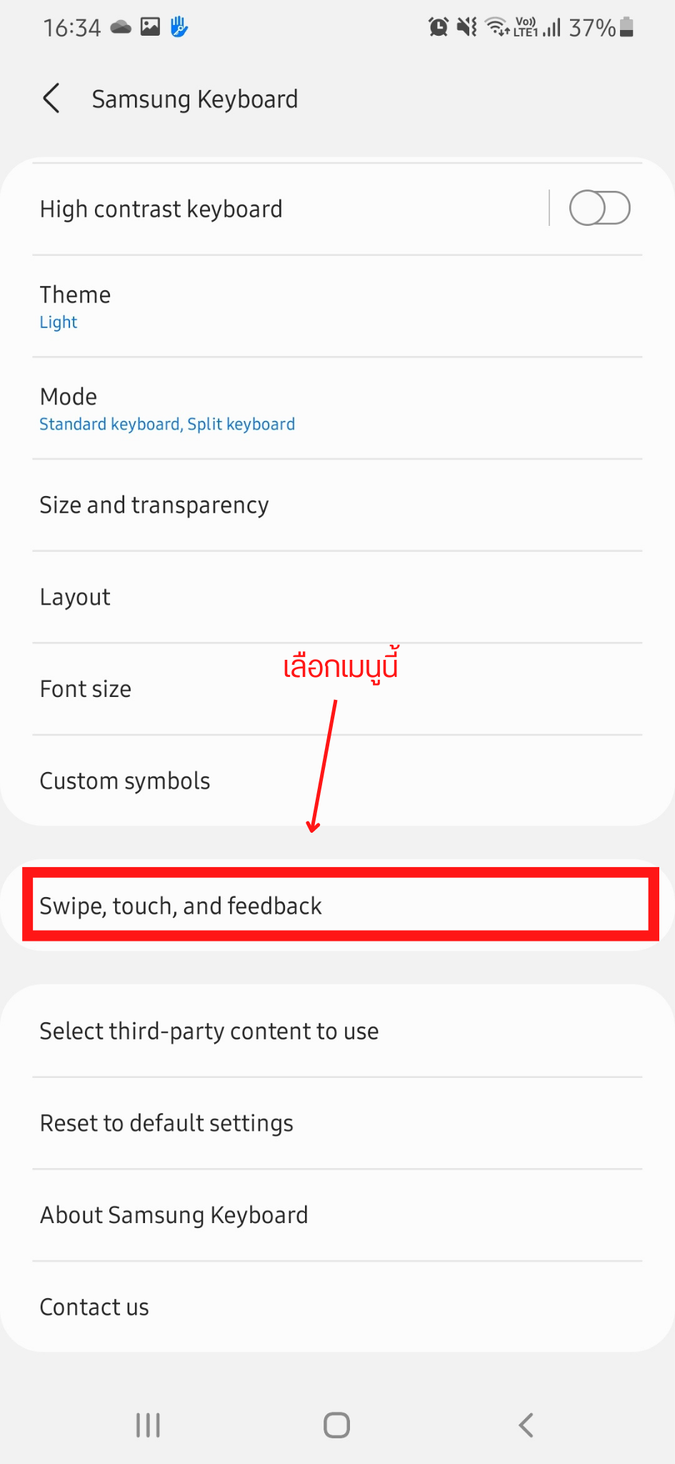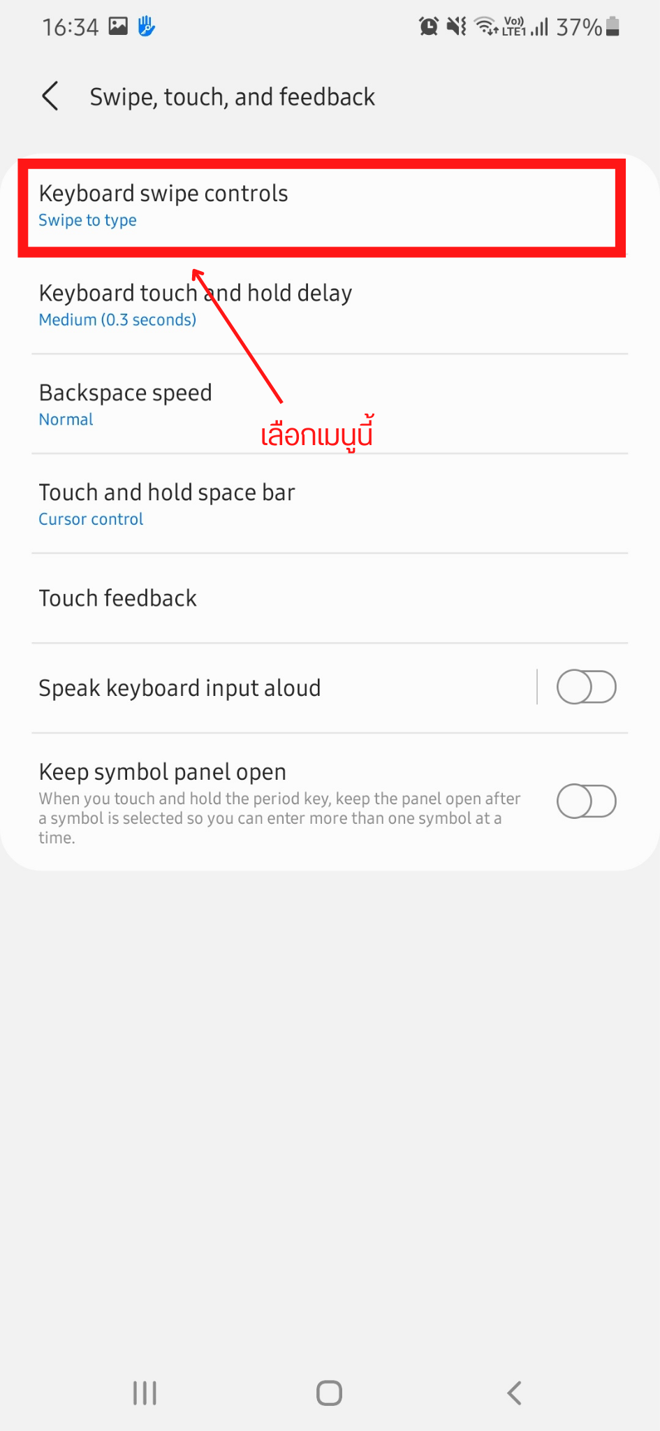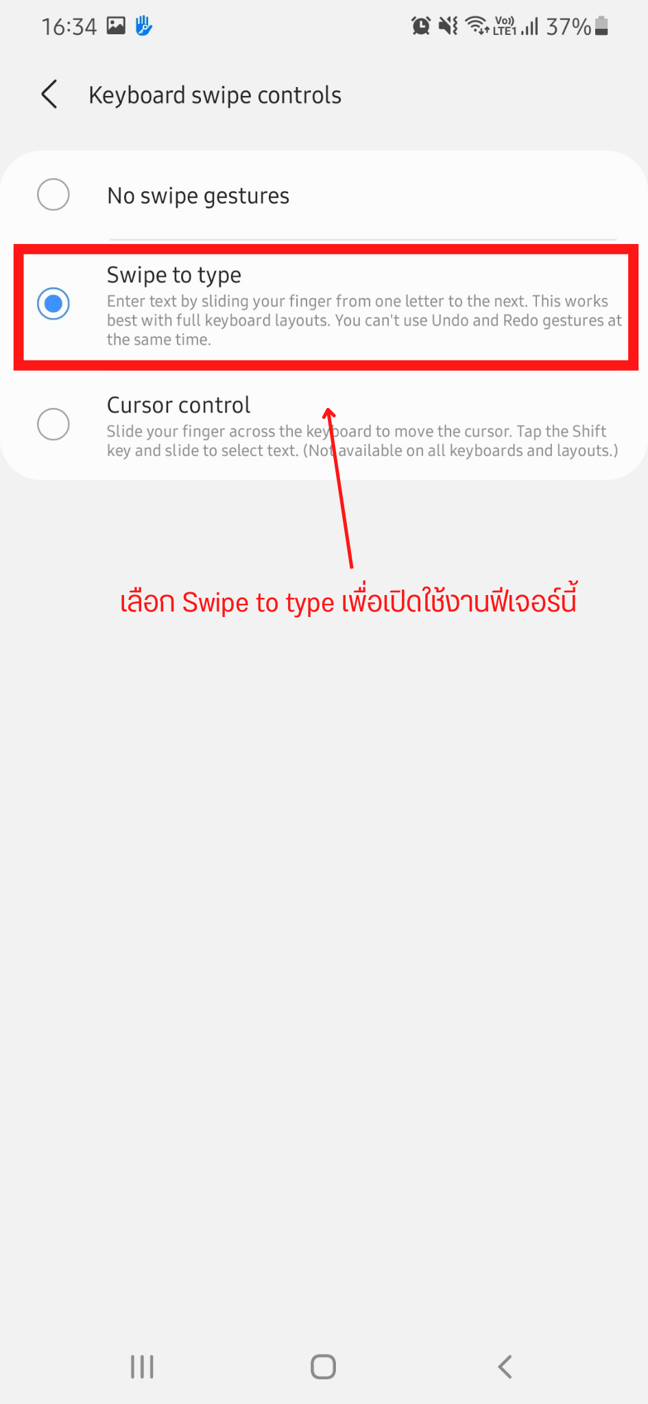 การพิมพ์ปกติอาจจะยังไม่ทันใจใครหลายคน Samsung Keyboard ก็มีฟีเจอร์เลื่อนนิ้วเพื่อพิมพ์เป็นคำได้เลยโดยไม่ต้องยกนิ้วออกจากจอ วิธีการเปิดใช้งานก็เพียงแค่ไปที่รูปฟันเฟืองในหน้าคีย์บอร์ด จากนั้นไปที่ Swipe, touch, and feedback และกดไปที่ Keyboard swipe controls และเลือก Swipe to type แค่นี้เราก็ใช้งานฟีเจอร์นี้ได้แล้ว