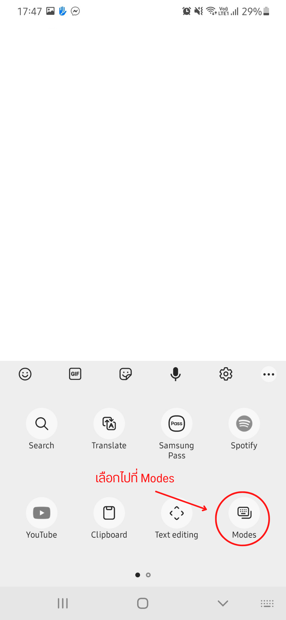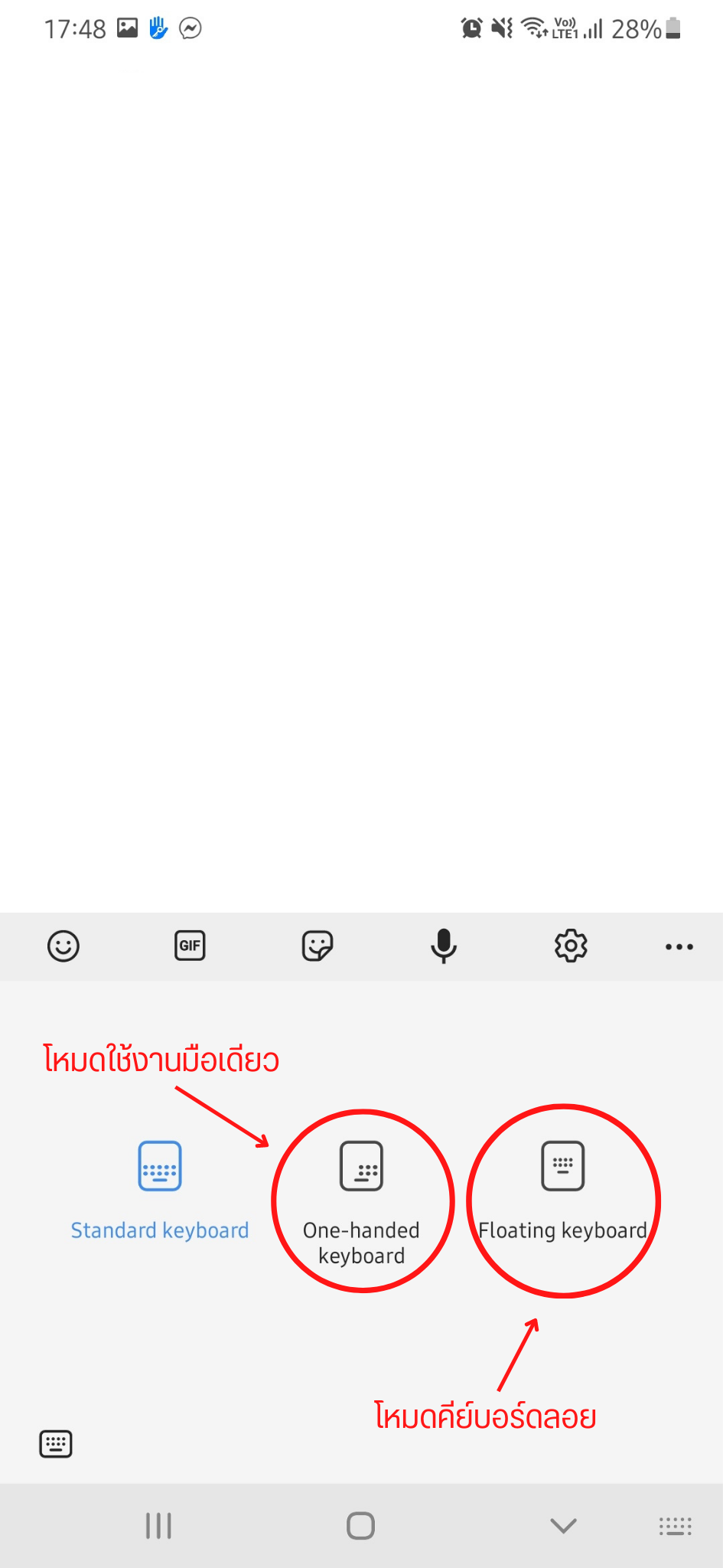 ใครถนัดพิมพ์คีย์บอร์ดมือเดียวแต่ติดปัญหาเอื้อมนิ้วไปไม่ถึง Samsung Keyboard ก็มีฟีเจอร์ One-handed keyboard สำหรับใช้งานมือเดียว และ Floating Keyboard สำหรับใช้งานคีย์บอร์ดแบบลอย วิธีการใช้งานง่ายมาก เพียงไปที่ Modes บนคีย์บอร์ด จากนั้นก็เลือกฟีเจอร์ที่เราต้องการใช้งานได้เลย