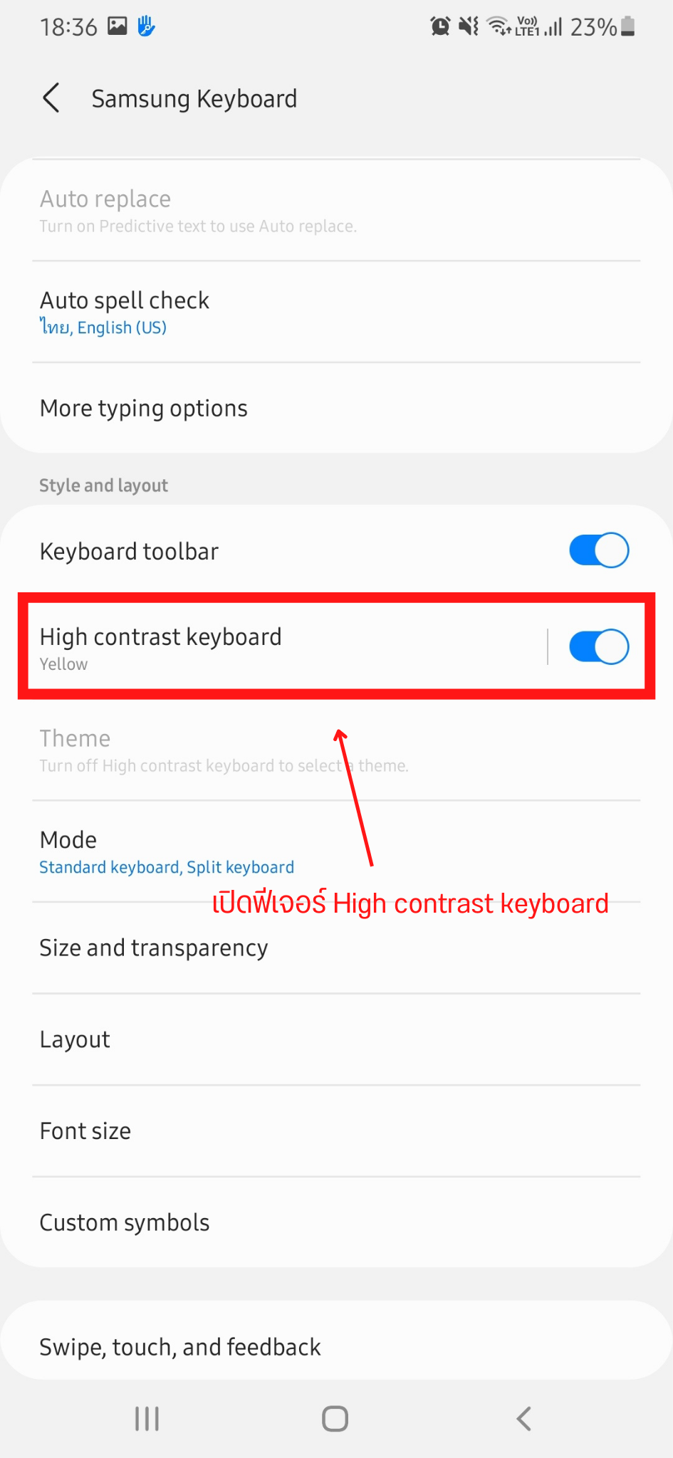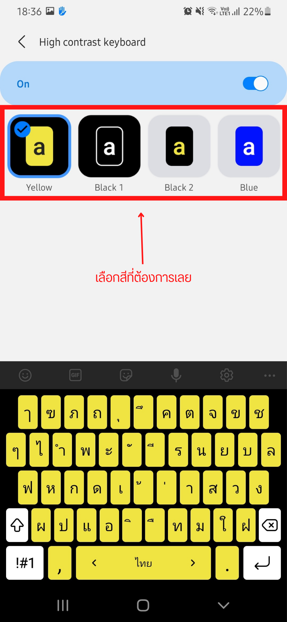 ถ้าหากว่าใช้คีย์บอร์ดสีขาวแบบนี้แล้วรู้สึกว่าเบื่อเกินไป Samsung Keyboard ก็สามารถเปลี่ยนสีได้ด้วยโหมด High contrast วิธีการคือ ไปที่รูปฟันเฟืองบนคีย์บอร์ด จากนั้นไปที่เมนู High contrast keyboard และกดเปิดใช้งาน และเมื่อเข้าไปที่เมนูจะสามารถเลือกสีคีย์บอร์ดที่เราต้องการได้เลย