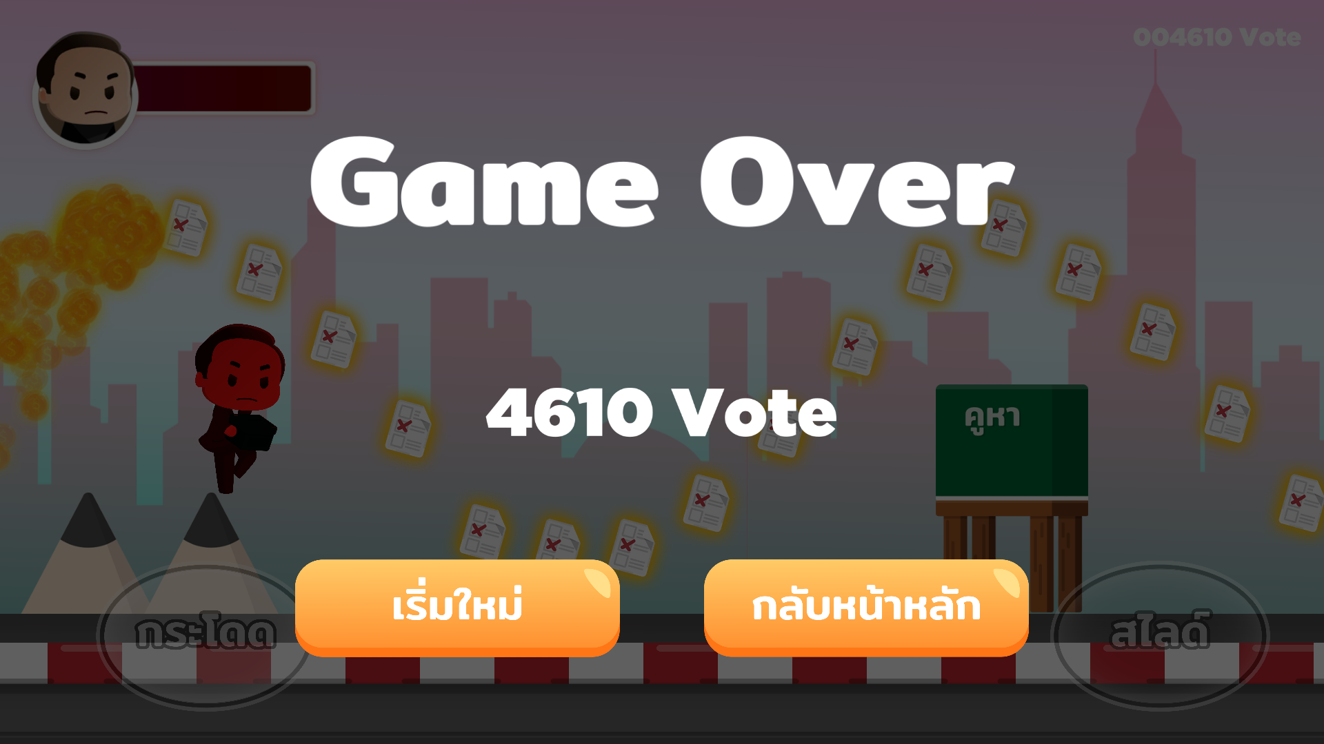 เริ่มเกมมาจะมีตัวละครให้เลือกเล่น แต่ตอนนี้เล่นตัวละครได้ตัวเดียว (ต้องรอเกมอัพเดตปลดล็อคตัวอื่นให้) สมมติให้ชื่อว่า “ลุงทูว” สกิลติดตัวรอเกมอัพเดตอีกที แต่ที่แน่ๆ ลุงทูวมีคะแนนโหวตมาให้แล้ว 250 คะแนน ที่เหลือก็ไปวิ่งเก็บเพิ่มในเกมต่อจ้า