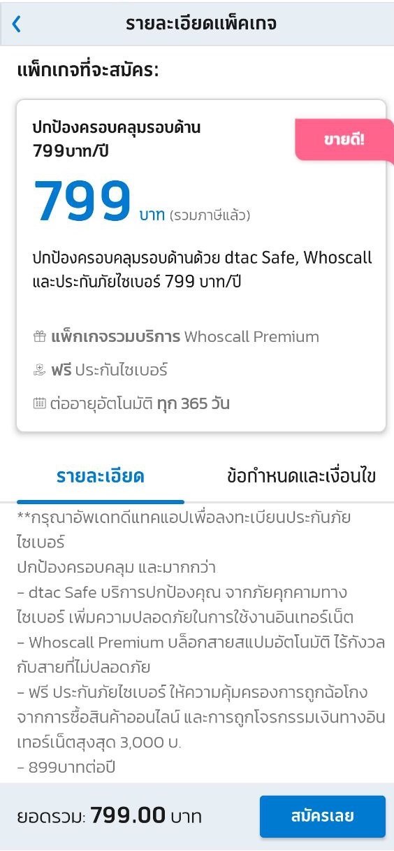 แพ็กเกจบริการเสริม บนแอป dtac ผู้ใช้งานจะได้รับการแจ้งเตือนและป้องกันการเข้าใช้งานเว็บไซต์ที่มีความเสี่ยงมีสแปม มัลแวร์ ภัยคุกคามทางไซเบอร์ หรือเว็บไซต์ที่ไม่เหมาะสม ตามฐานข้อมูลในระบบ ซึ่งตอนนี้ มีให้บริการเฉพาะดีแทคเท่านั้น แต่อีกไม่นานลูกค้าทรู ก็จะได้ใช้บริการนี้ด้วยเช่นกัน