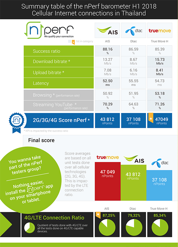 nPerf แอปพลิเคชั่นที่ใช้ทดสอบความเร็วอินเตอร์เน็ตที่ดาวน์โหลดได้ฟรีและมีผู้ใช้ทดสอบมากมาย ทั้งเครือข่ายมือถือและผู้ใช้บริการ ซึ่งทาง nPerf ได้ยกให้ TrueMove H เป็นอันดับ 1 ของเครือข่ายมือถือในประเทศไทย มีผลการทดสอบดีที่สุด 4 จาก 6 KPI สำคัญ โดยมีคนเข้ามาทดสอบผ่านแอปของ nPerf กว่า 5.5 แสนครั้งตลอดช่วงครึ่งปี 2018 ที่ผ่านมา
