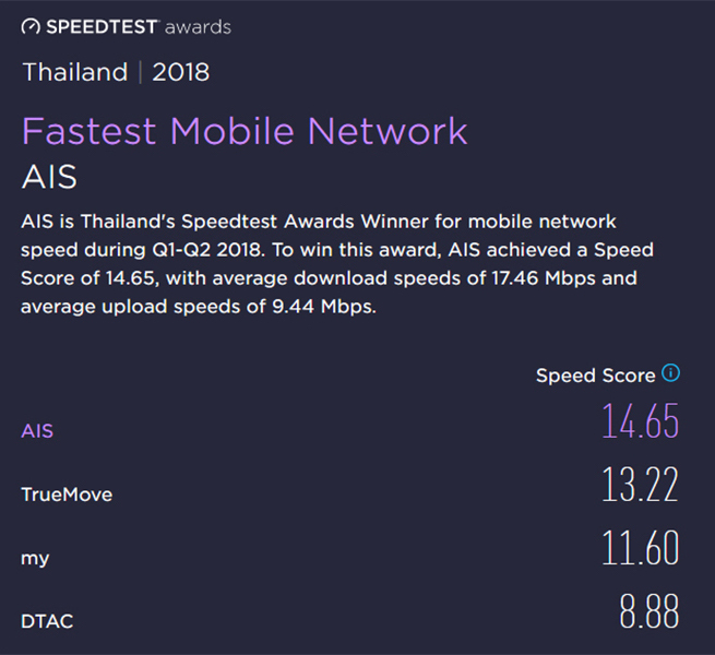 สำหรับปีนี้ AIS ได้รางวัลจากทาง Ookla Speedtest เป็นปีที่ 4 ติดต่อกันแล้วว่าเป็นเครือข่ายมือถือที่เร็วที่สุดในประเทศไทย และมีค่าเฉลี่ย Latency ต่ำที่สุด โดยทาง AIS ได้เคลมว่าเป็นผลจากการพัฒนาเครือข่ายหลายด้าน รองรับเทคโนโลยีใหม่ๆอย่าง MIMO 4×4 with CA, 256 QAM DL/64 QAM UL, LAA (Licensed Assisted Access) และ FDD Massive MIMO 32T 32R แบบครบเซทเลยนั่นเอง