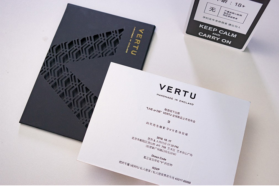 บัตรเชิญสุดหรูสีดำที่มาในซองสีทองถูกส่งไปให้สื่อหลายสำนักในประเทศจีน โดยงานเปิดตัวนี้ใช้ชื่อว่า “Live or Die” จะจัดที่กรุงปักกิ่งประเทศจีนในวันที่ 17 ตุลาคมนี้ ซึ่งคาดว่าน่าจะเปิดตัวสมาร์ทโฟนพรีเมี่ยมดูหรูหราและแฟนซีตามสไตล์ของ Vertu แน่นอน