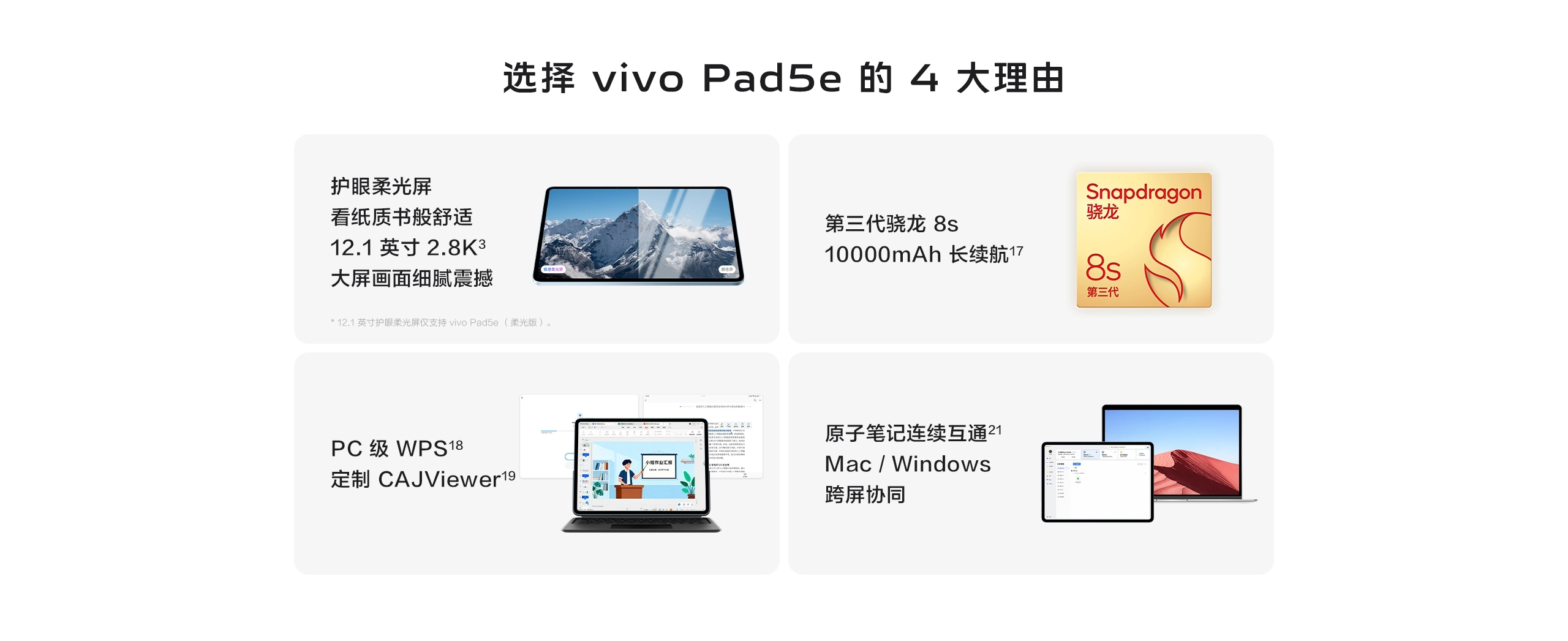 vivo Pad 5e คือแท็บเล็ตที่มีราคา และสเปคนับอยู่ในช่วง mid-range ด้วยหน้าจอ IPS LCD ขนาดใหญ่ถึง 12.1 นิ้ว ชิปเซ็ตประมวลผลจากค่าย Qualcomm อย่าง Snapdragon 8s Gen 3 และแบตเตอรี่ความจุ 10,000mAh กับความเร็วการชาร์จ 44W กล้องหลังความละเอียด 8MP และกล้องหน้า 5MP