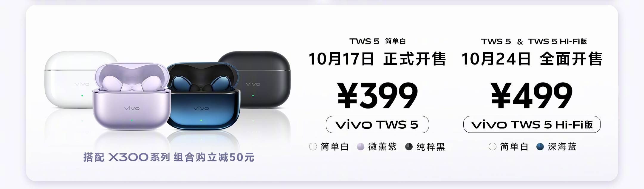 สุดท้ายก็คือ vivo TWS 5 หูฟังไร้สายเรือธงรุ่นล่าสุดของทางบริษัทที่มาพร้อมกับจุดเด่นอย่าง ไดรเวอร์เสียงขนาด 11 มม. พร้อมรองรับการเชื่อมต่อสัญญาณ Bluetooth 5.4 มีวางจำหน่ายอยู่ด้วยกันทั้งหมด 2 รุ่น ได้แก่ รุ่นมาตรฐาน (Standard) และ รุ่น Hi-Fi