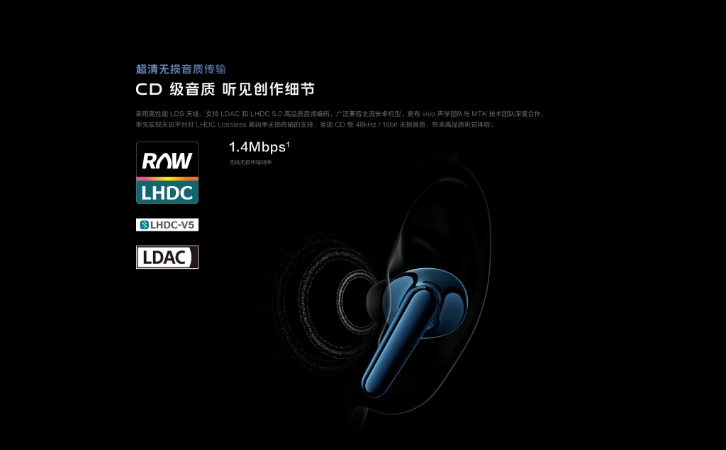สำหรับ vivo TWS 5 รุ่นมาตรฐาน จะรองรับโคเดกเสียง AAC, SBC และ LDAC ในขณะที่ตัวเลือกรุ่น Hi-Fi จะเพิ่มการรองรับคุณภาพเสียงระดับสูงอย่าง LHDC พร้อมกับเทคโนโลยีเสียง DeepX 4.0 Stereo Sound เข้ามาด้วย สำหรับประสบการณ์การฟังเพลงหรือคุณภาพของเสียงที่มีมิติและสมจริงยิ่งขึ้นกว่าเดิม