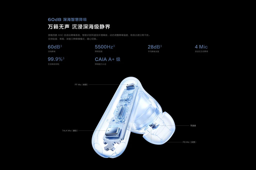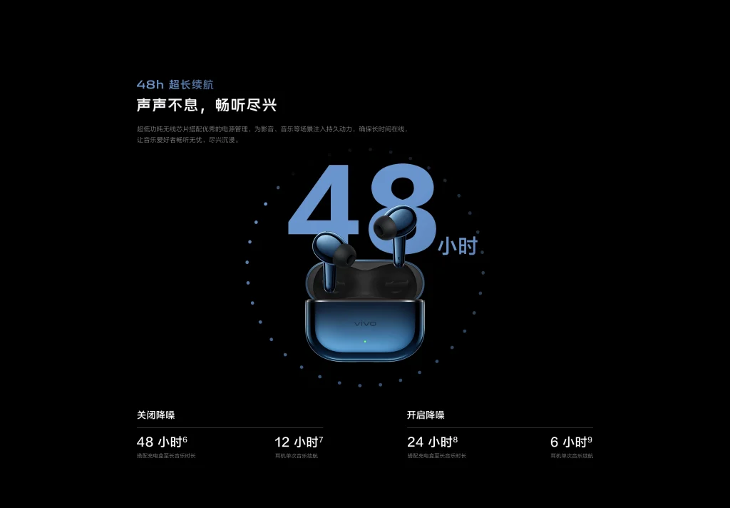 ในส่วนของระบบตัดเสียงรบกวน (ANC) สามารถลดเสียงรบกวนได้สูงสุดถึง 60 เดซิเบล (dB) โดยที่ทาง vivo ก็เคลมเอาไว้ว่าสามารถใช้งานได้นานสูงสุดถึง 48 ชั่วโมง (รวมเคสชาร์จ) เมื่อปิด ANC และใช้งานได้ยาวนานประมาณ 24 ชั่วโมง เมื่อเปิดใช้งาน ANC