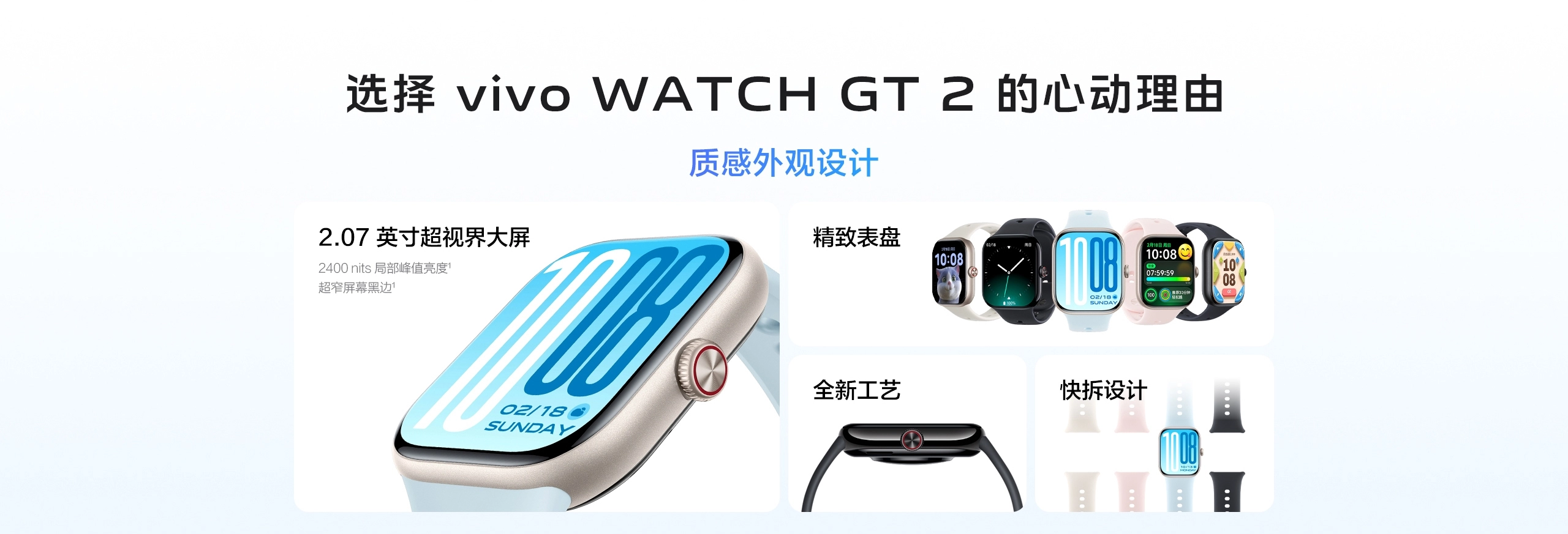 vivo Watch GT 2 มาพร้อมดีไซน์หน้าปัดทรงสี่เหลี่ยมและปุ่มหมุน Digital Crown ทางด้านขวา เลือกใช้พาเนลหน้าจอแบบ AMOLED ขนาด 2.07 นิ้ว พร้อมความสว่างหน้าจอสูงสุด 2,400 nits แสดงผลได้คมชัดแม้อยู่กลางแจ้ง มีลำโพงและไมโครโฟนในตัวสำหรับการโทรศัพท์ผ่านนาฬิกาโดยตรง
