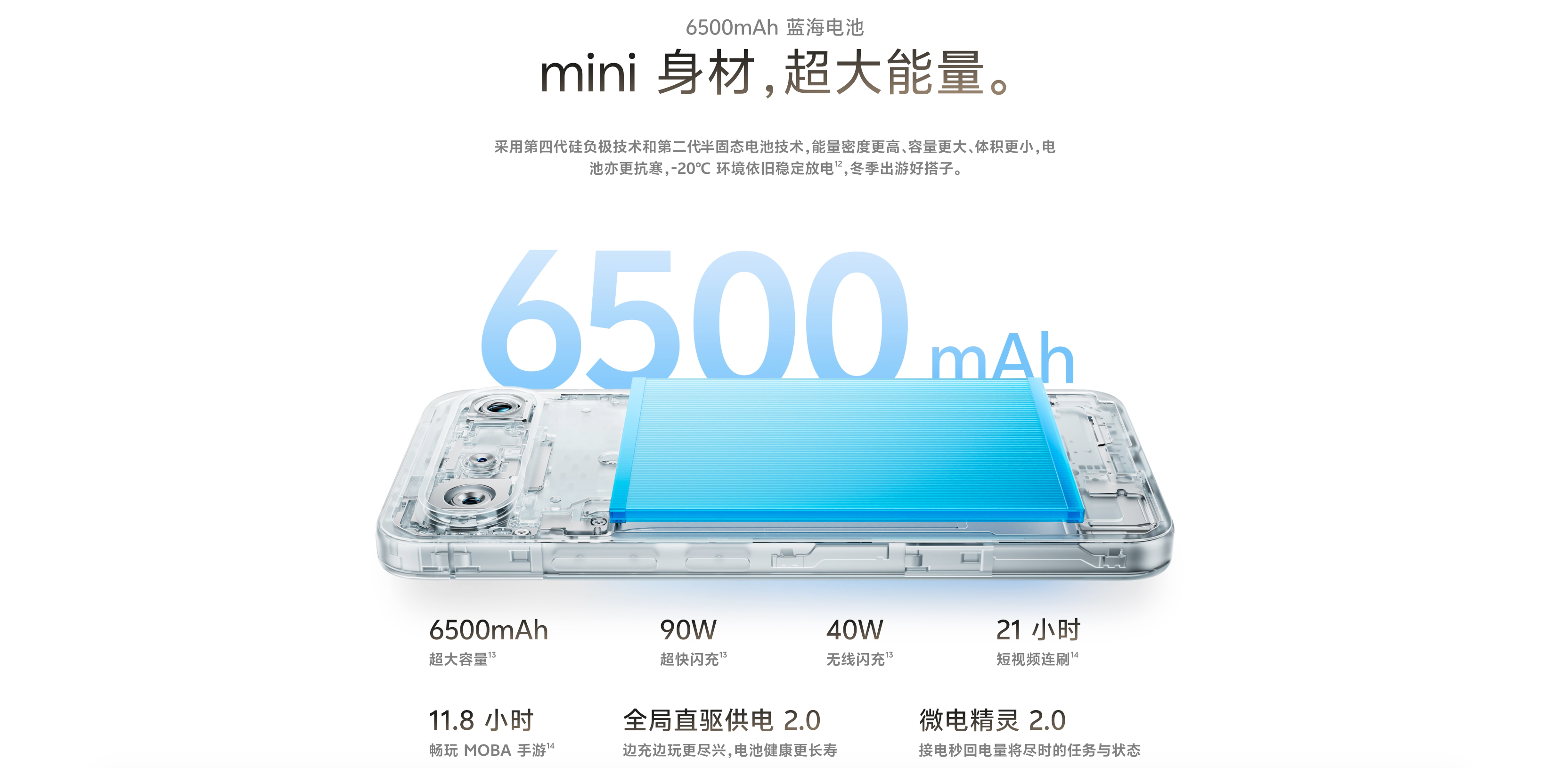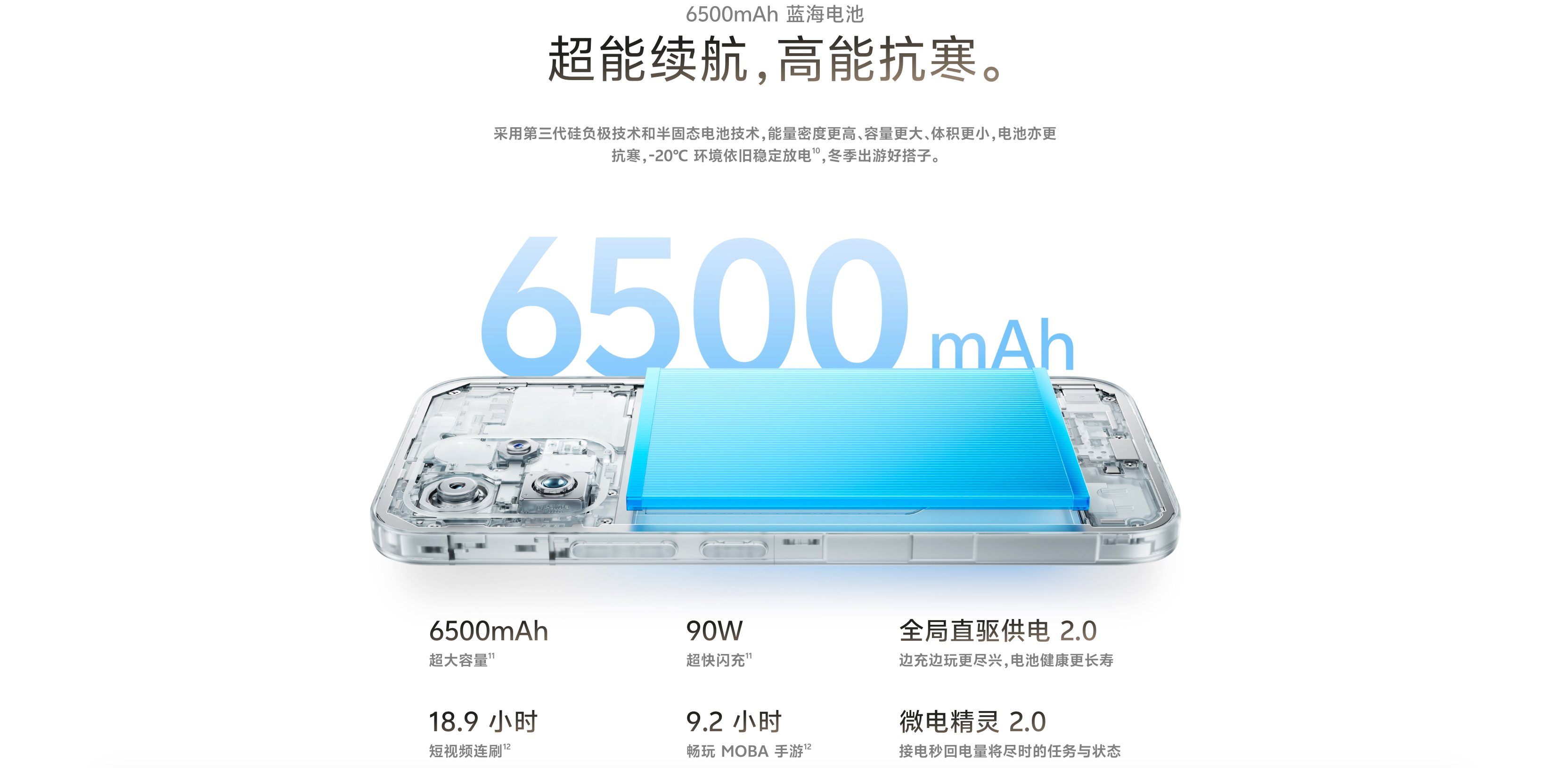 แบตเตอรี่มีความจุ 6,500mAh และชาร์จไว 90W เหมือนกัน แต่จะเพิ่มเติมมาด้วยการรองรับการชาร์จไร้สาย 40W และการชาร์จบายพาส 2.0 ด้วยประสิทธิภาพการจัดการพลังงานของชิปเซ็ตรุ่นใหม่ ทำให้สามารถใช้งานเพื่อดูวิดีโอได้นานถึง 21 ชั่วโมง