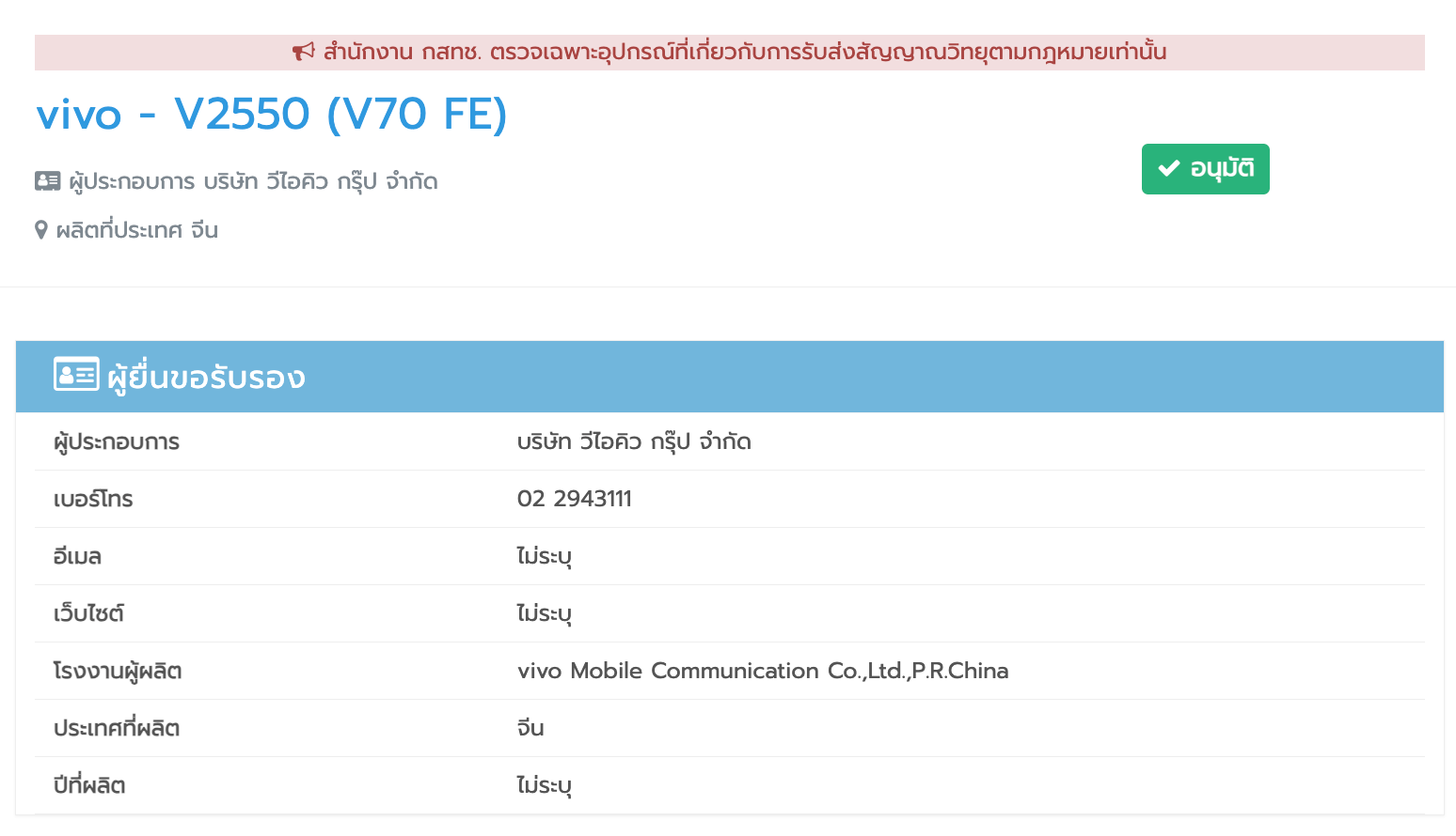 vivo V70 FE รุ่นใหม่ผ่านการรับรอง กสทช. แล้ว