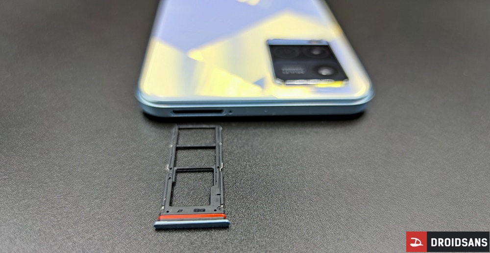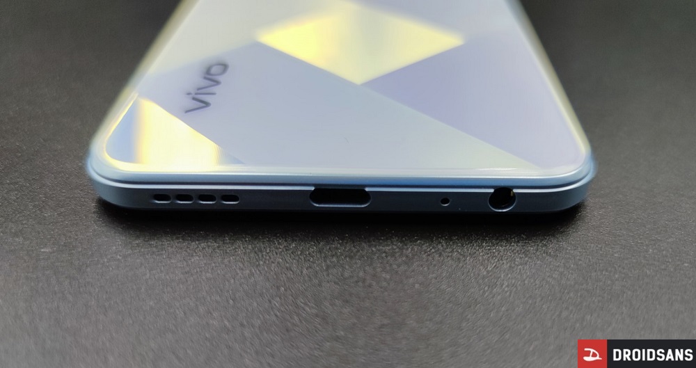 ขอบเครื่องด้านล่างมีพอร์ต USB-C, รูหูฟัง 3.5 มม., รูไมค์ และลำโพง ส่วนขอบเครื่องด้านบนเป็นช่องใส่ถาดซิม