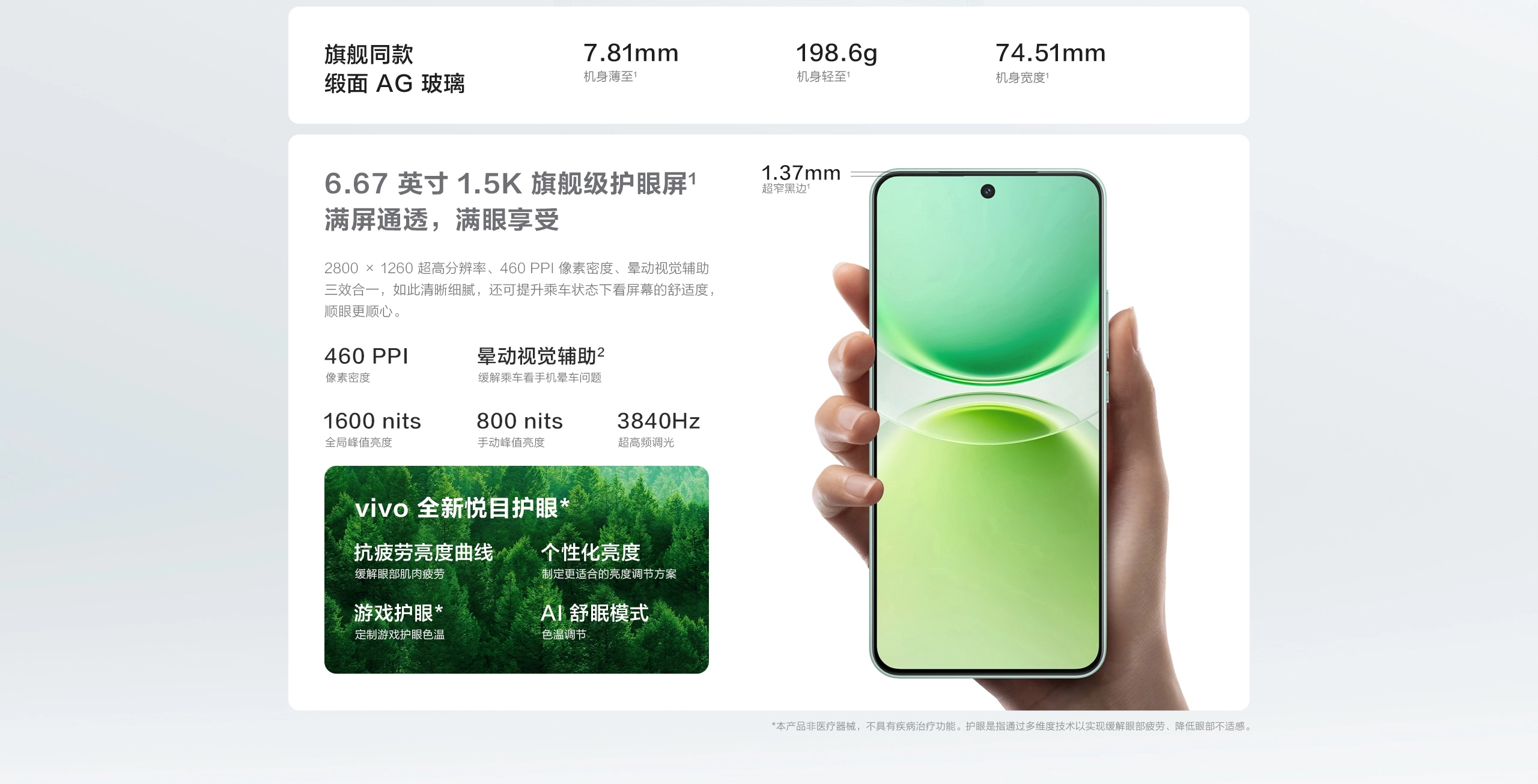 vivo Y500 Pro มาพร้อมหน้าจอ AMOLED ขอบแบน 6.67 นิ้ว อัตรารีเฟรช 120Hz พร้อมกับความละเอียด 1.5K ความสว่างหน้าจอสูงสุดแบบปรับเอง 800 นิต (สูงสุดทั่วหน้าจอ 1,600 นิต) ขอบหน้าจอบางเฉียบ 1.37 มม. ครอบทับด้วยกระจกหน้าจอ Diamond Shield