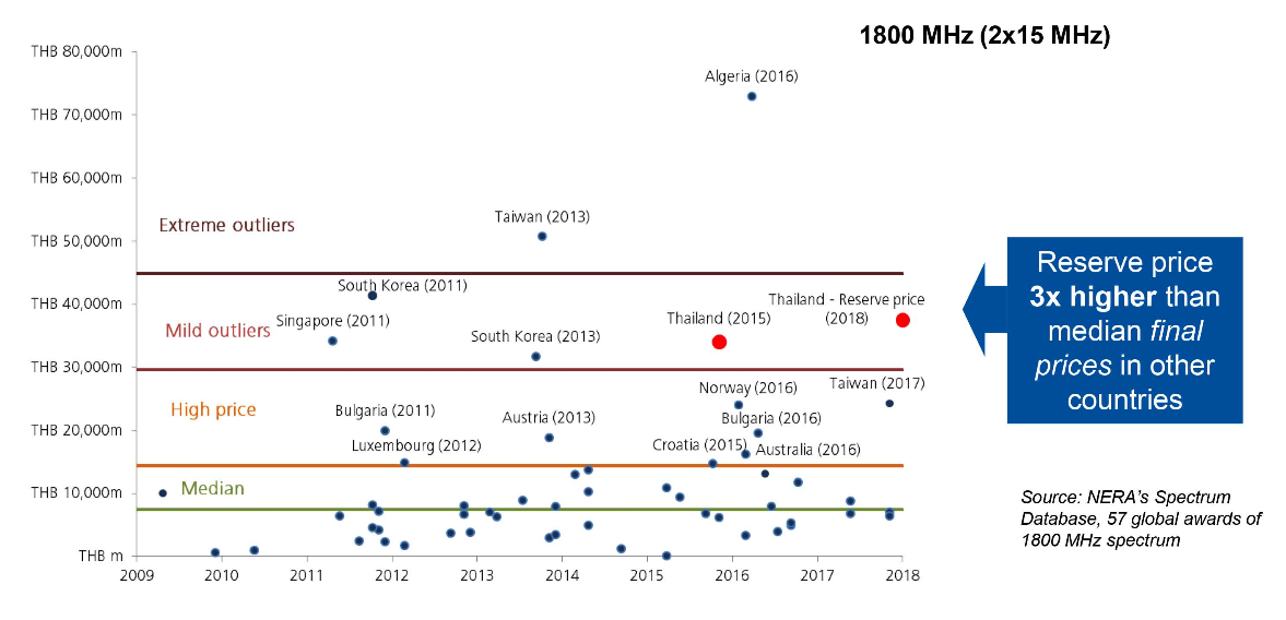 ส่วนคลื่น 1800MHz แม้ว่าการประมูลของไทยจะยังไม่ขึ้นไปถึงอันดับหนึ่งของโลก แต่ว่าราคาก็ยังพุ่งกระฉูดไม่น้อยเลยค่าเฉลี่ยไปพอสมควร