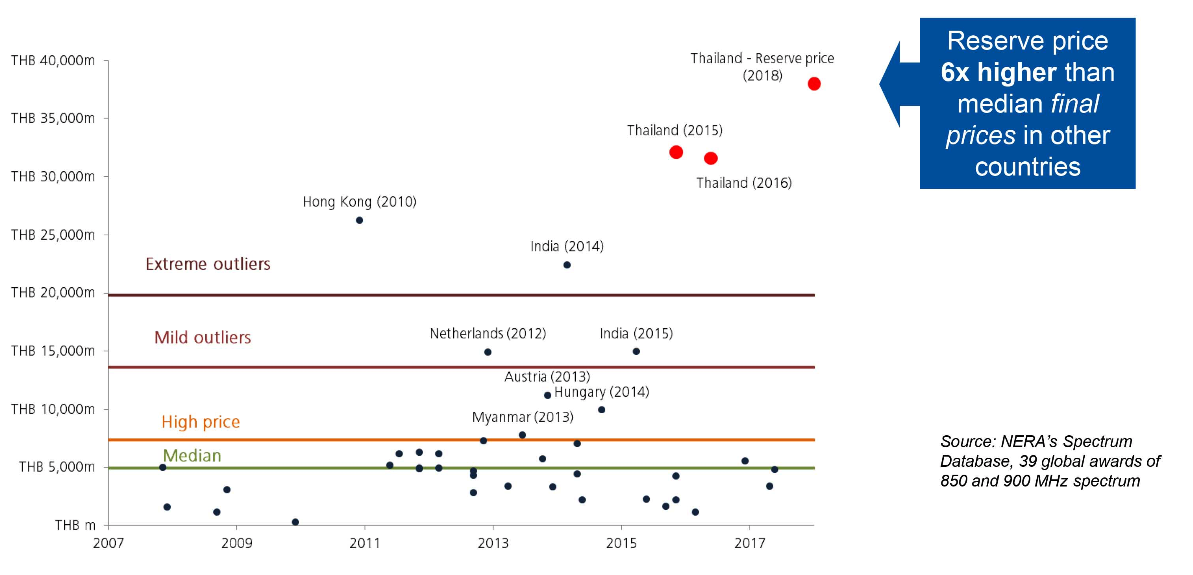 จากข้อมูลข้างต้น ทางเนร่าได้มีการให้ข้อมูลเปรียบเทียบราคาประมูลคลื่นความถี่ของไทยว่าสูงกว่าจากต่างประเทศ โดยเฉพาะคลื่น 900MHz ที่ขึ้นแท่นเป็นอันดับหนึ่งว่าแพงที่สุดในโลกกันไปเลย