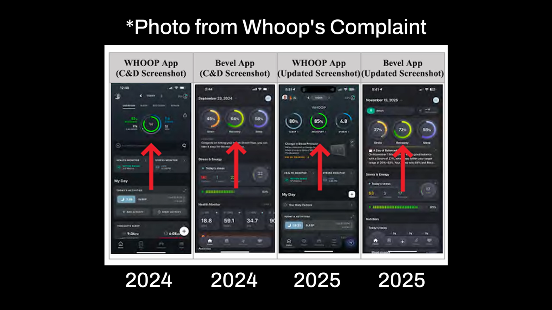 หนักไปกว่านั้นก็คือ Whoop กล่าวหาว่าหน้าต่างเมนูหรือการแสดงผลในส่วนต่าง ๆ บนแอปของ Bevel คล้ายคลึงกับแอปของ Whoop มากจนเกินไป โดยเฉพาะกราฟแสดงสถานะทรงกลมซึ่งแสดงค่าสถานะต่าง ๆ เช่น Strain, Recovery และ Sleep