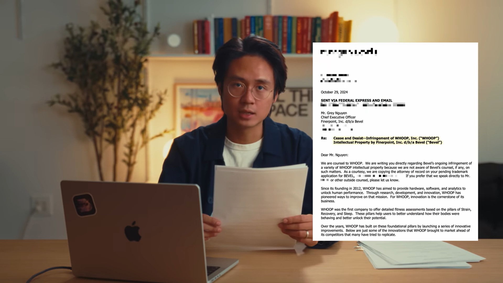 Grey Nguyen ซีอีโอคนปัจจุบันของ Bevel เปิดเผยว่าในเอกสารความยาว 111 หน้า ที่ทาง Whoop ได้ยื่นฟ้องนั้น มีการกล่าวหาว่าทางบริษัทละเมิดสิทธิบัตร และการออกแบบดีไซน์หรือ UI โดยรวมของแอปพลิเคชัน ซึ่งอาจทำให้ผู้บริโภคเกิดความสับสนหรือเข้าใจผิดได้ง่าย ๆ