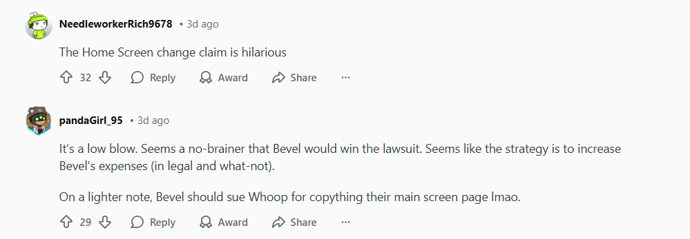 โดยเฉพาะหน้าตาแอปที่เป็นกราฟทรงกลมซึ่ง Whoop กล่าวหาว่า Bevel ลอกเลียนแบบตนเอง Grey Nguyen ก็ระบุว่าเป็นทาง Whoop ไม่ใช่เหรอที่อัปเดตหน้าตากราฟทรงกลม 3 วงแบบนี้ออกมาทีหลัง Bevel ซึ่งทำมาก่อนหน้านี้ด้วยซ้ำ และพร้อมจะงัดหลักฐานหรือข้อมูลทุก ๆ อย่างออกมาโต้แย้ง