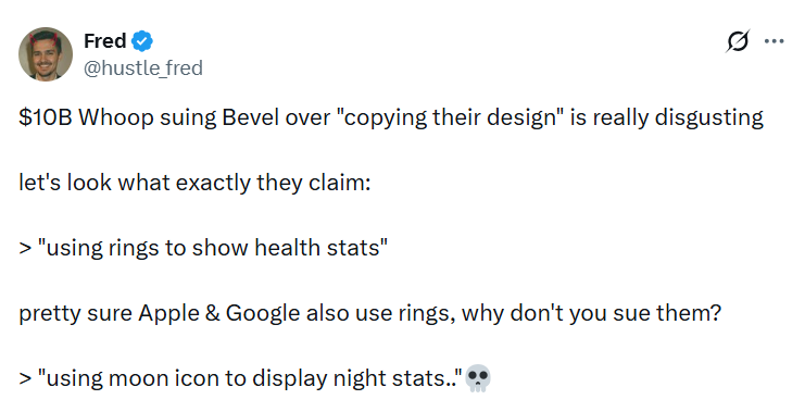 CEO ของ Bevel สตาร์ทอัพขนาดเล็กที่ทำแอปรวมข้อมูลสุขภาพเปิดเผยว่า Whoop ยื่นฟ้องด้วยข้อหาในการ ‘ละเมิดสิทธิบัตรและหน้าตาดีไซน์แอป’ ซึ่งอาจทำให้ผู้บริโภคสับสนได้ แต่ที่สับสนกว่าก็คือบางอย่าง Bevel ทำมาก่อน Whoop ด้วยซ้ำ !