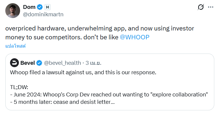 ยิ่งไปกว่านั้นหากย้อนกลับไปในปี 2024 ทาง Whoop เคยติดต่อหาผู้ก่อตั้ง Bevel เพื่อพยายามจะร่วมงานกันในทางธุรกิจด้วยซ้ำ แถมยังกล่าวชมประสิทธิภาพการทำงานของแอปว่าน่าประทับใจมากขนาดไหน แต่ด้วย ณ ตอนนั้น Bevel เพิ่งเปิดตัวมาได้แค่ 6 เดือน เลยปฏิเสธดีลนั้นไปเพราะมองว่ายังไม่มีทรัพยากรที่มากพอ