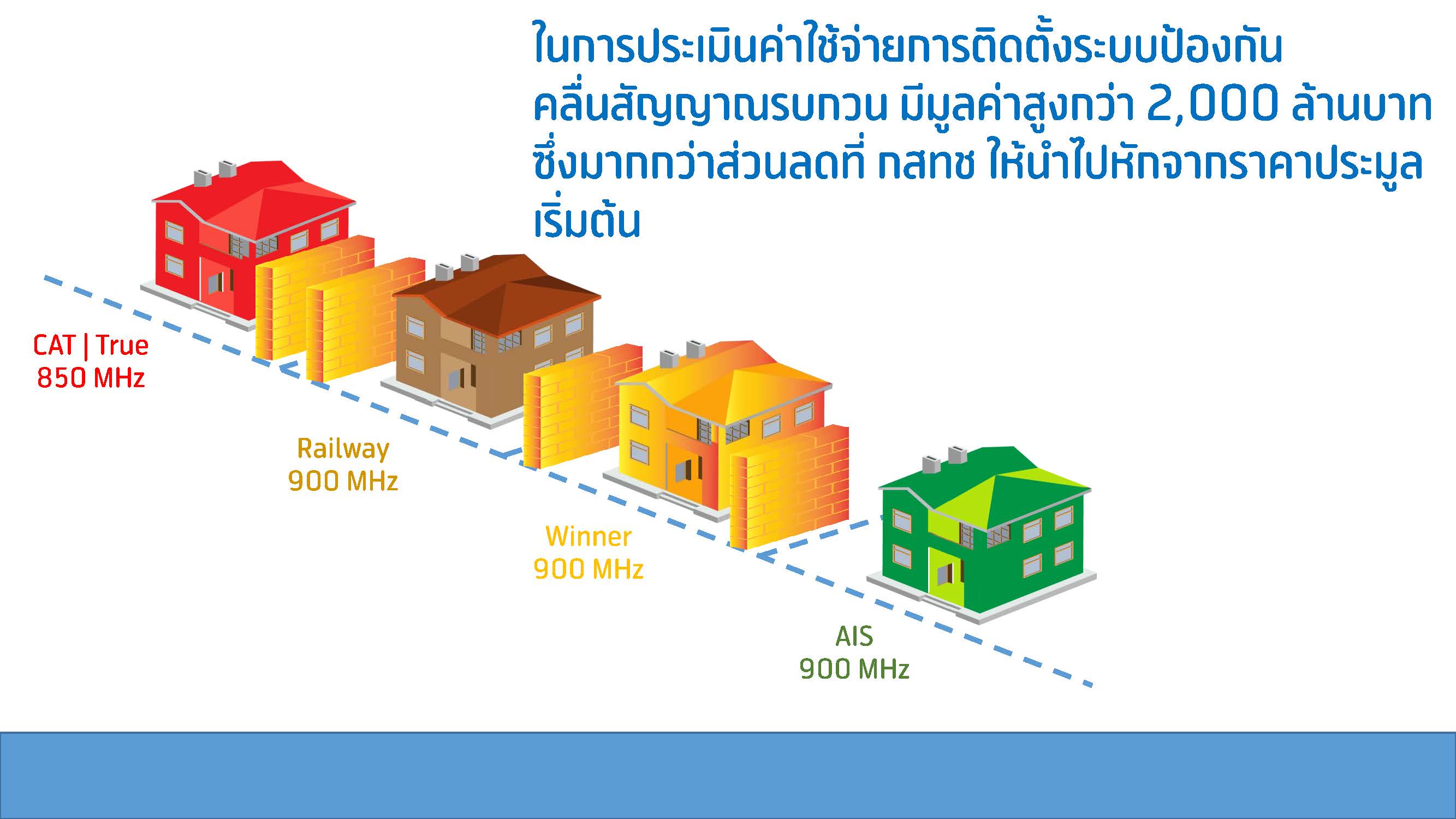 - เงื่อนไขการประมูลคลื่น 900 MHz กำหนดให้ผู้ชนะต้องรับผิดชอบติดตั้งระบบป้องกันคลื่นสัญญาณรบกวนทั้งหมด