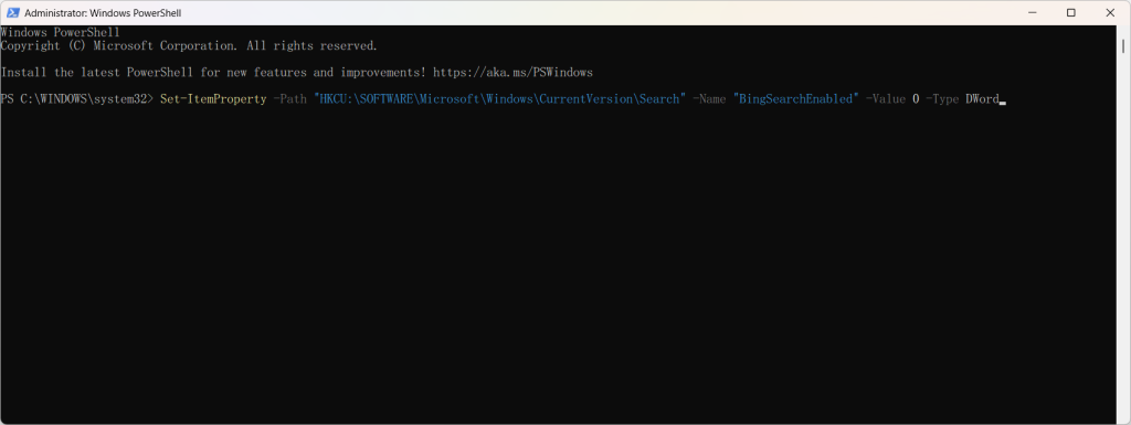 - พิมพ์โค้ดตามนี้ Set-ItemProperty -Path “HKCU:\SOFTWARE\Microsoft\Windows\CurrentVersion\Search” -Name “BingSearchEnabled” -Value 0 -Type DWord