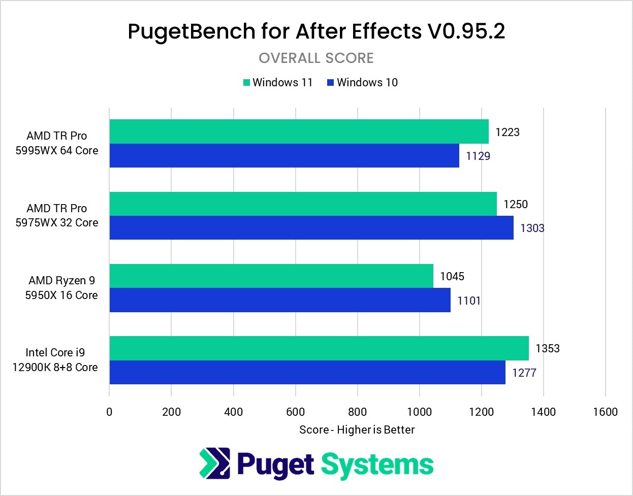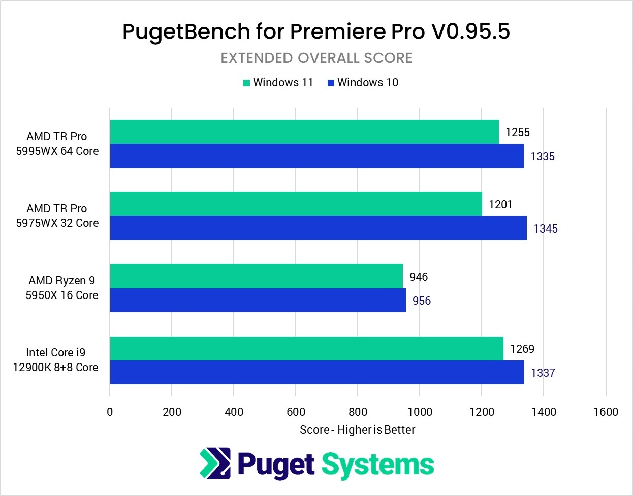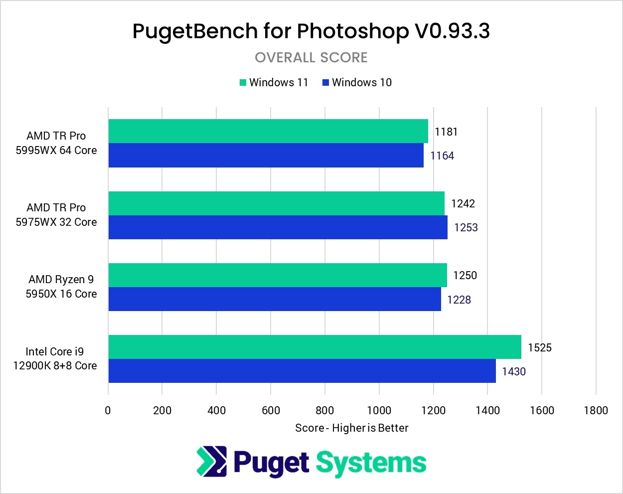 ปัจจุบันผ่านไป 8 เดือน Puget ได้ทดสอบ Windows 11 เวอร์ชันล่าสุดที่ผ่านการอัปเดตแก้บัคต่าง ๆ แล้วร่วมกับฮาร์ดแวร์ชุดเดิมอีกครั้ง ซึ่งประกอบไปด้วยซีพียู 4 รุ่น ได้แก่ Core i9-12900K, Ryzen 9 5950X, Threadripper Pro 5975W และ Threadripper Pro 5995W และแบ่งการทดสอบ PugetBench ออกเป็น 5 หมวด ได้แก่