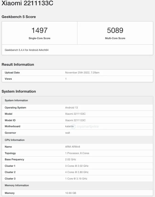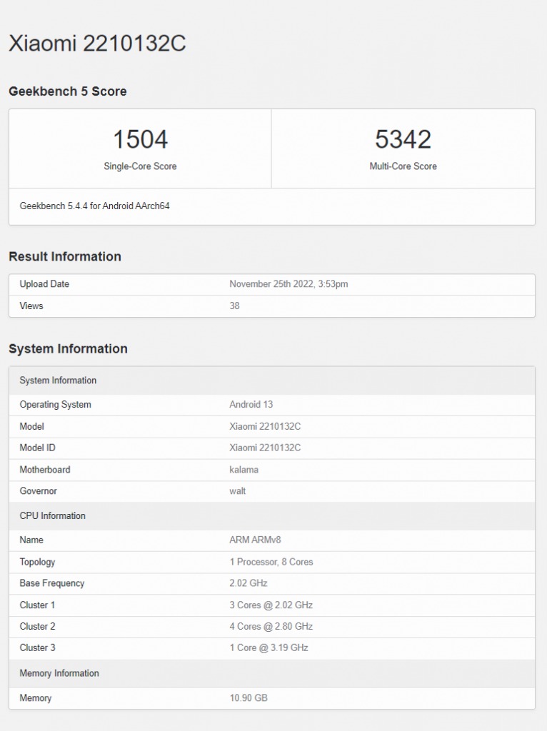 Xiaomi 13 Pro ใช้ชื่อโมเดลว่า 2210132C จะเห็นได้ว่าใช้ CPU แบบ octa-core มีแกนหลัก 1 แกน @ 3.19GHz แกน, แกนประสิทธิภาพ 4 แกน @ 2.80 GHz, และแกนประหยัดพลังงาน @ 2.02 อีก 1 แกน พอดูค่าต่าง ๆ เหล่านี้ก็ทำให้เรารู้ได้เลยว่าใช้ชิป Snapdragon 8 Gen 2 แน่นอน