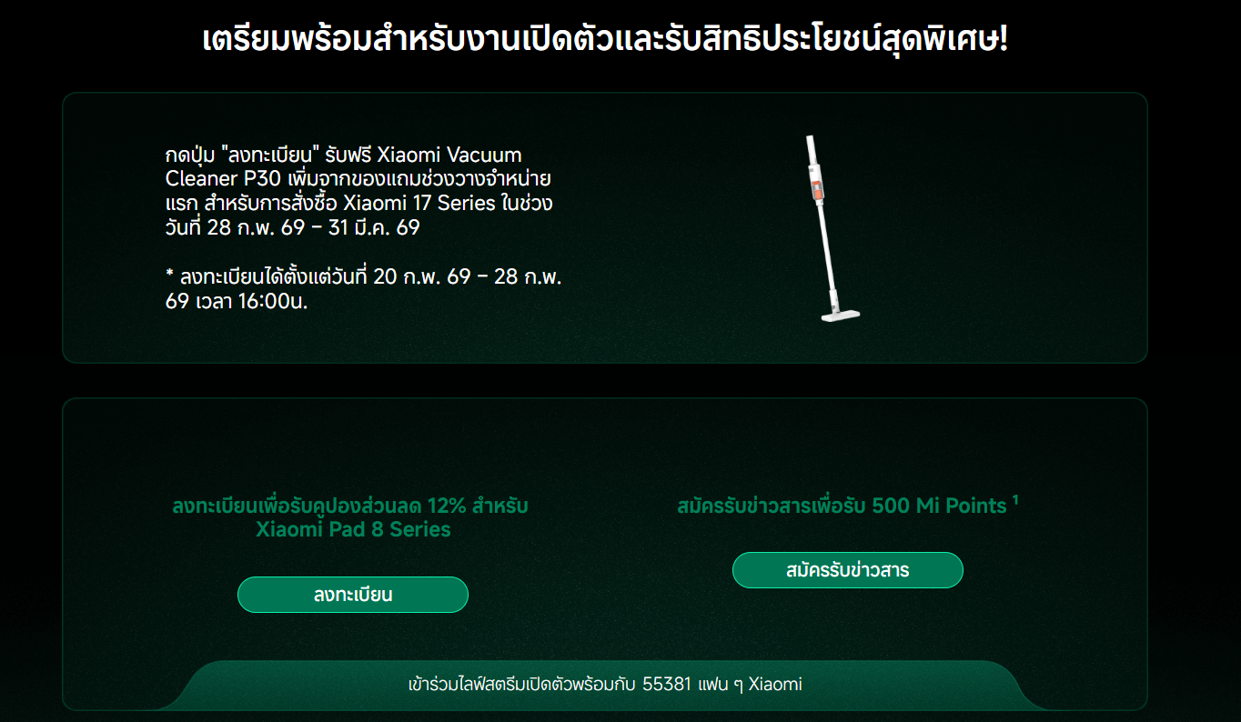 โปรโมชันลงทะเบียนบนหน้าเว็บ Xiaomi สำหรับการสั่งซื้อ Xiaomi 17 Series เพื่อรับของแถมเพิ่มเติม รับฟรี Xiaomi Vacuum Cleaner P30 นอกจากนั้นยังสามารถกดลงทะเบียนเพื่อรับ คูปองส่วนลด 12% สำหรับ Xiaomi Pad 8 Series