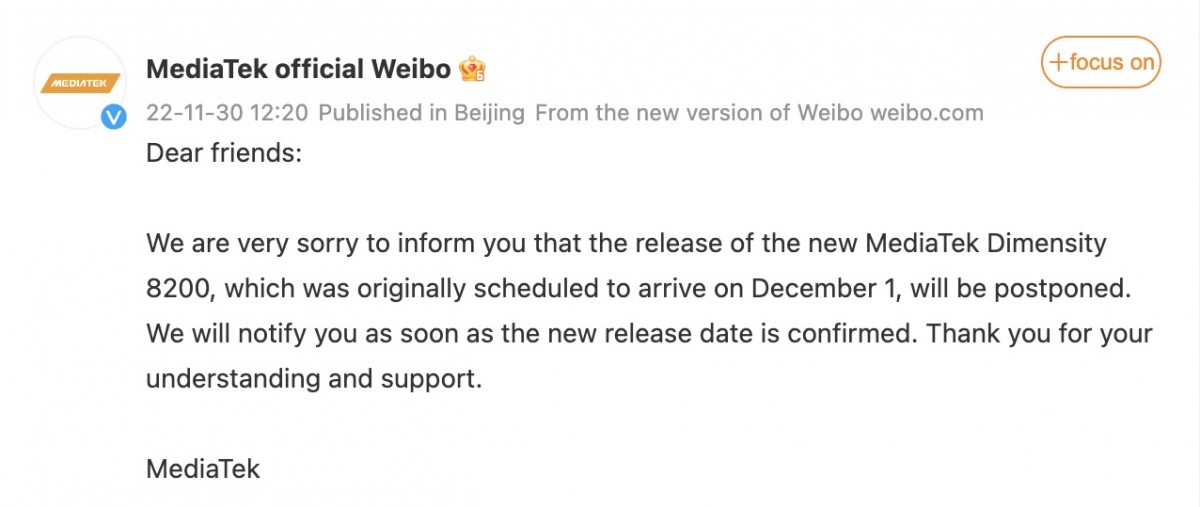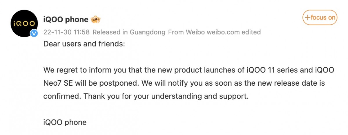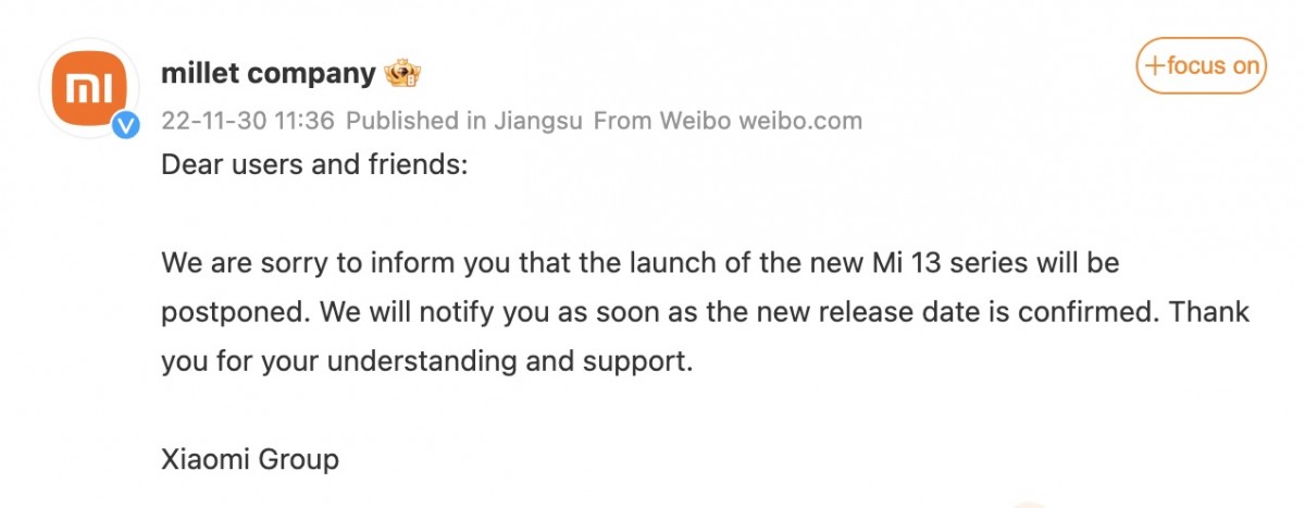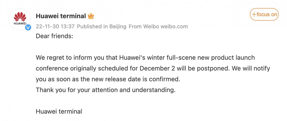 4 แบรนด์ใหญ่ ๆ จากจีนอย่าง Xiaomi, HUAWEI, IQOO และ MediaTek ต่างโพสประกาศเลื่อนเปิดตัวสินค้าโดยไม่ได้ให้เหตุผลว่าเป็นเพราะสาเหตุใด อีกทั้งยังไม่ได้เปิดเผยรายละเอียดกำหนดการใหม่ออกมาให้ทราบ ซึ่งสาเหตุของการเลื่อนจัดงานในครั้งนี้อาจเป็นเหตุเนื่องมาจาก อดีตประธานาธิบดีของจีนอย่าง เจียง เจ๋อหมิน ได้ถึงแก่วัยอสัญกรรมเมื่อวันที่ 30 พฤศจิกายนที่ผ่านมา
