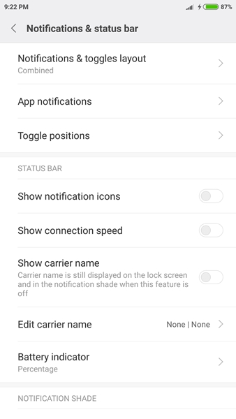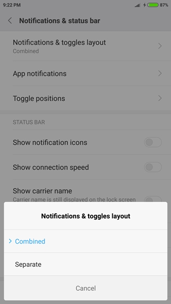 สำหรับส่วนการแจ้งเตือนหรือ Notification ใน MIUI นั้น เราสามารถปรับค่าได้หลายอย่าง ทั้งในส่วนของ Layout ที่เลือกว่าจะเป็นแบบ Noti และ toggles อยู่รวมกัน (Combined) หรือแบบแยกคนละหน้า (Separate) นอกจากนั้นก็ปรับได้ว่าจะให้แอปไหนแสดงข้อความแจ้งเตือนได้บ้าง (App notifications) และจัดเรียงตำแหน่งของ toggles ต่างๆได้เอง