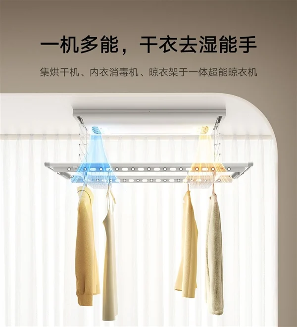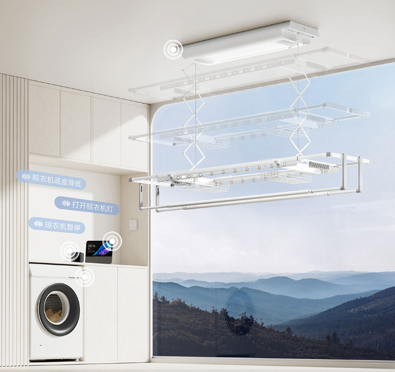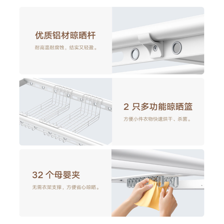 MIJIA Smart Clothes Dryer 1S เป็นราวตากผ้าอัจฉริยะที่สามารถห้อยติดกับเพดาน หรือจะฝังไว้ใต้ฝ้าก็ได้ สามารถปรับราวขึ้นลงตามการใช้งานได้อัตโนมัติผ่านสวิตช์ควบคุม และผ่านแอป ตัวราวเหมาะกับพื้นที่แคบ ๆ เพราะเมื่อพับเก็บจะมีความสูงแค่ 9.9 ซม. เท่านั้น ผ้าเยอะก็ไม่ต้องกังวลเพราะรองรับน้ำหนักผ้าได้ถึง 35 กิโลกรัม มีไม้หนีบผ้าในตัว 32 อัน มีราวตากเสริมที่สามารถพับเก็บได้ 2 อัน และมีตะกร้าสำหรับวางผึ่งชุดชั้นใน และตุ๊กตาเล็ก ๆ 2 ฝั่ง