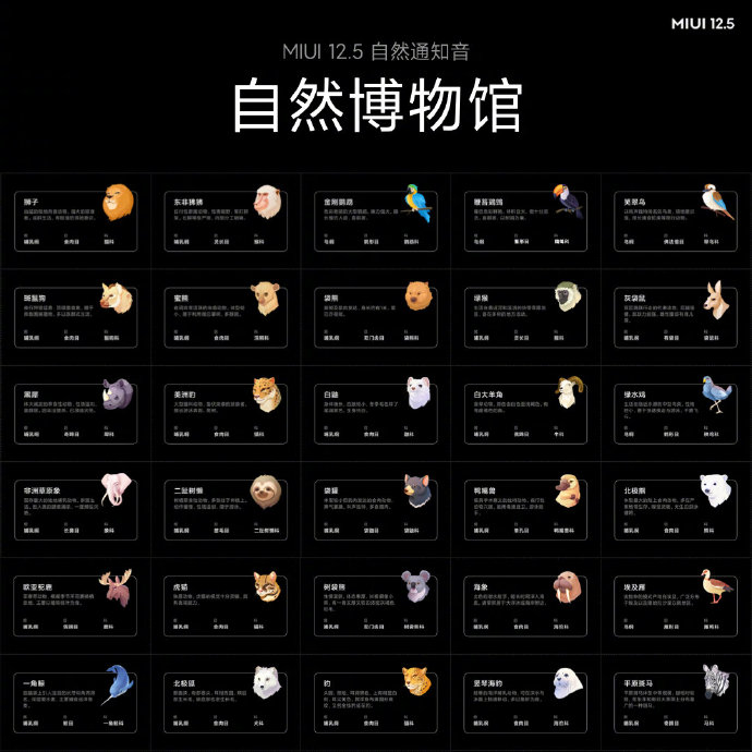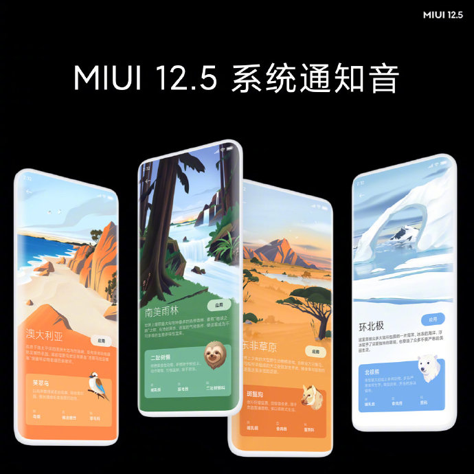 ปกติแล้วเสียงการแจ้งเตือนของระบบ MIUI ได้ใช้เสียงจากธรรมชาติมาโดยตลอด ตั้งแต่ปี 2018 (แถมยังได้รับรางวัล Red Dot Award ปี 2019 มาแล้วด้วย) ซึ่ง Xiaomi ได้ทำงานร่วมกับศิลปินทั่วโลก ด้วยการนำเสียงจากธรรมชาติ และสัตว์ต่าง ๆ ในหลายพื้นที่ เช่น ป่าฝนในอเมริกาใต้, ออสเตรเลีย, ทุ่งหญ้าในแอฟริกาตะวันออก และรอบ ๆ ที่อยู่อาศัยใกล้กับบริเวณขั้วโลกเหนือ มาปรับใช้ใน MIUI 12.5 โดยมีมากกว่า 120 เสียง ให้ผู้ใช้งานสามารถนำไปมิกซ์แอนด์แมทช์เลือกใช้กันได้ตามใจชอบ